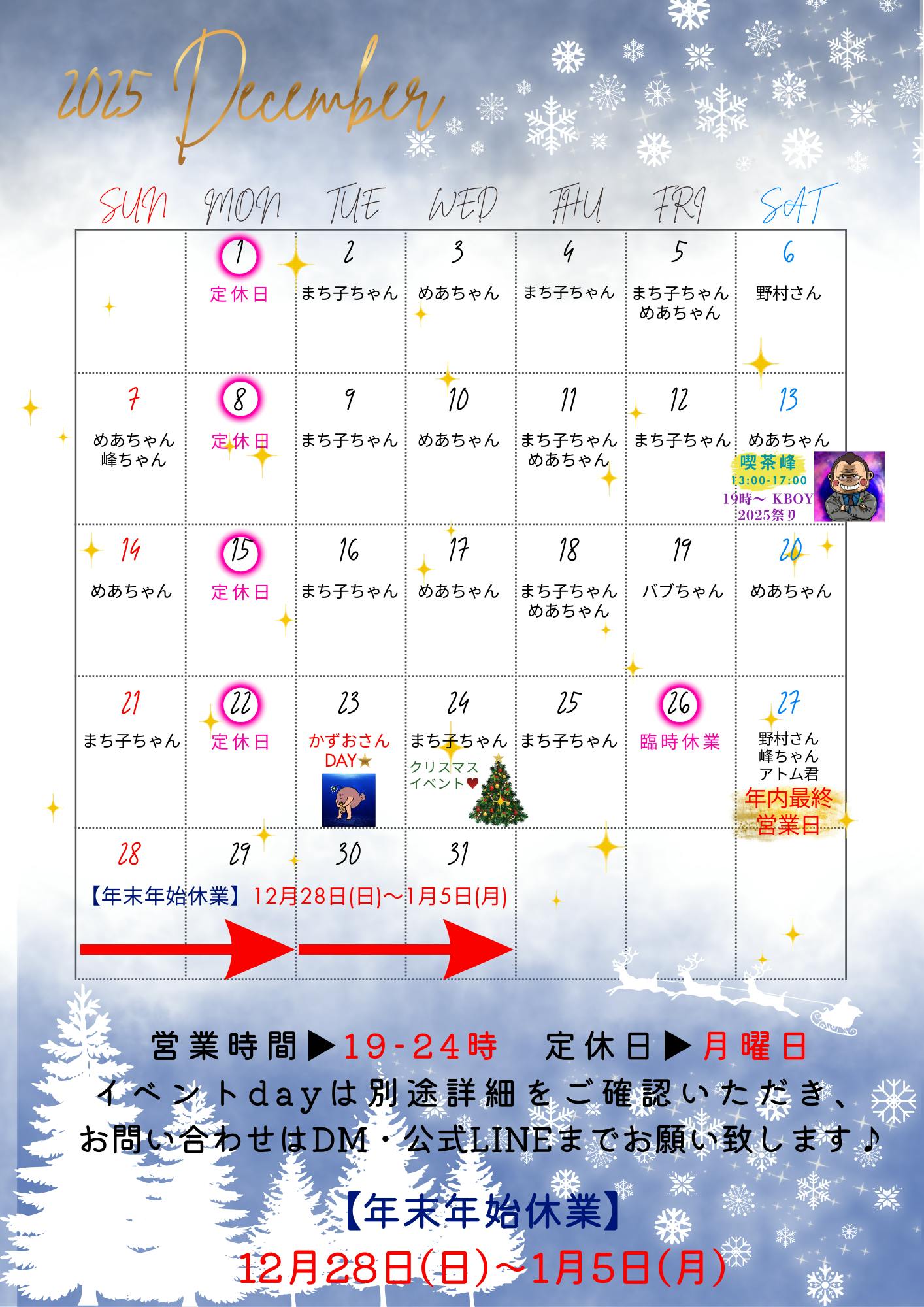 2025/12/01 19:00すっかり冬の気配を感じる寒さになってきましたが、皆様いかがお過ごしでしょうか。cafe&bar中間省略です。12月の営業のご案内になります。あの男が帰ってくる!!12月23日は高円寺の帝王、かずお君がお店に立ってくれます。色々と質問したい方、一度会ってみたかった方、たくさんいらっしゃると思います。一日店長デーのような枠は作りませんので、お好きなタイミングで遊びにいらしください。クリスマスと言ったらbarですよね?ディナーを食べて、barでかっこつけて、聖夜を迎える…そんなリア充がクリスマスに飲みに来るわけないとはわかっているんですが、12月24日はきちんとクリスマスイベントを開催いたします!まち子ちゃんがイベントを行っていますので、遊びにいらしていただけると喜びます!年末年始の営業のご案内です。最終営業日は12月27日、野村さんと峰とアトムでお送りいたします。早いものでお店を引き継いでから早いものでもうすぐ半年になるのですね。最後まで駆け抜けますので、皆様お誘いあわせの上、遊びにいらしていただければ幸いです。今月も宜しくお願い致します。 もっと見る11月の営業報告