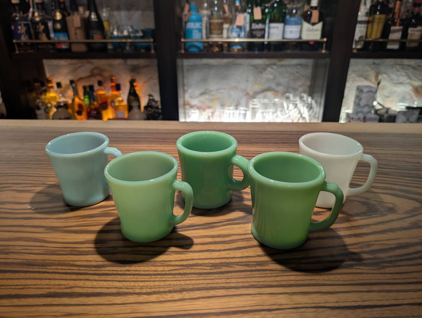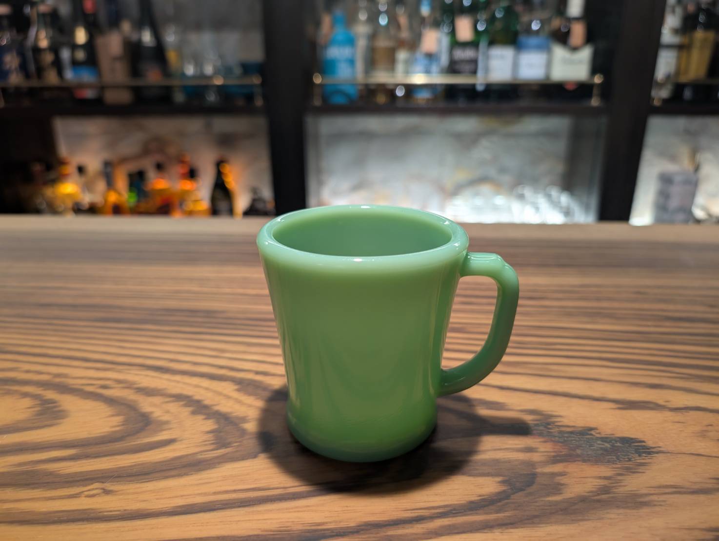 ファイヤーキングは一般的にグラスの底にある刻印で年代を判断できます。これの刻印は”ブロック体”で「FIRE-KING oven grass」という文字がうっすら見える個体です。これは1940年代の初期にわずかに作られていたため、おおよその年月を考えても80年以上は経過していることになります。80年も前のマグがまだこの世に残っていてそれでコーヒーや紅茶を飲める。そこにロマンを感じませんか?※ちなみに相場で40,000円となっております。売主さんの家にあったら教えてください。買取ます。