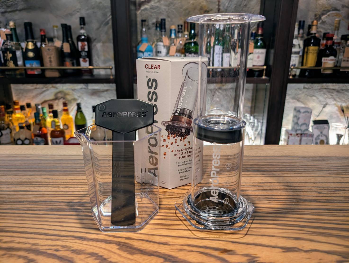 エアロプレス、という器具になるのですが、フレンチプレスの浸漬式と、空気で押し出すエスプレッソの原理を兼ね備えており、現状この子で入れたエスプレッソ(厳密にはエスプレッソ風)を使用したカフェオレは濃厚でたまらないです。