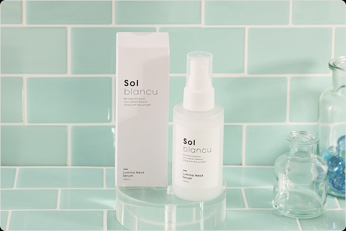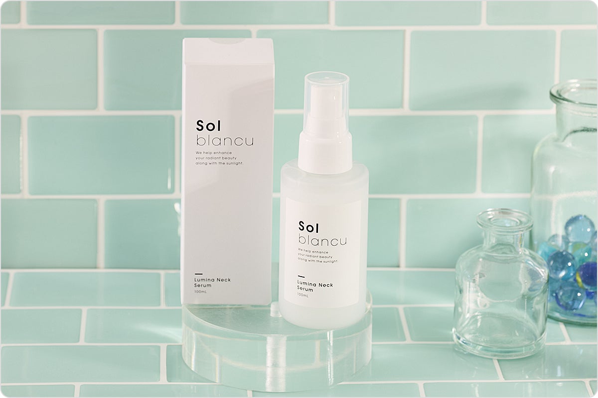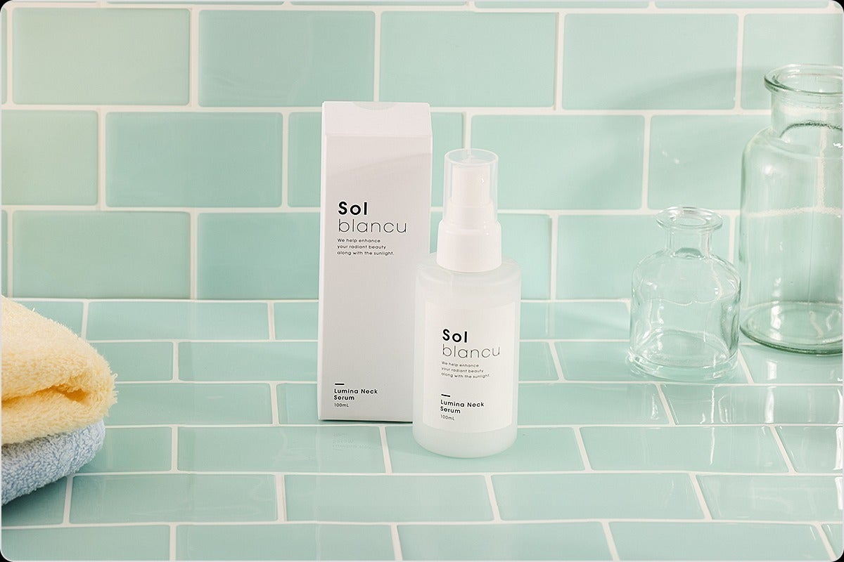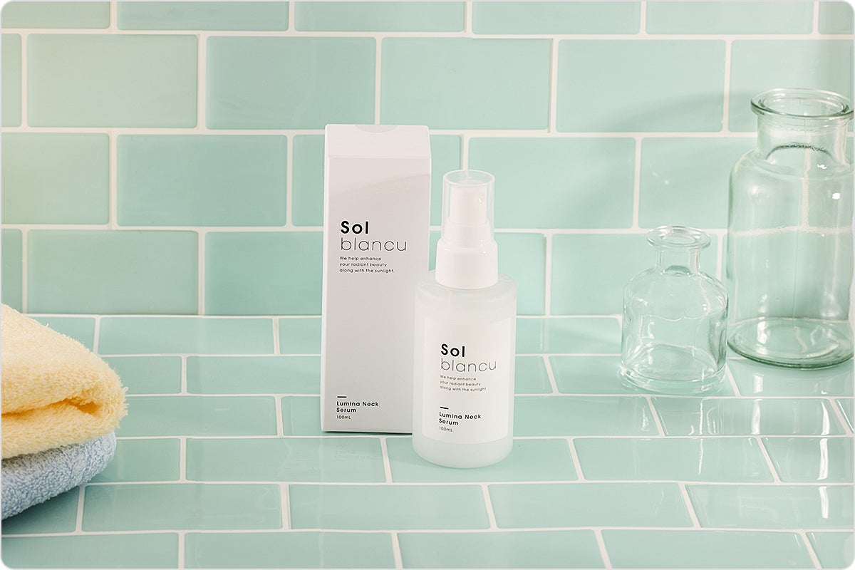 このふたつを同時に達成することが、大切な洋服を汚すことなく、顔と首のトーンの差を埋めることができる方法であると考え、誕生したのが、Solblancu(ソルブランク)「ルミナネックセラム」です。