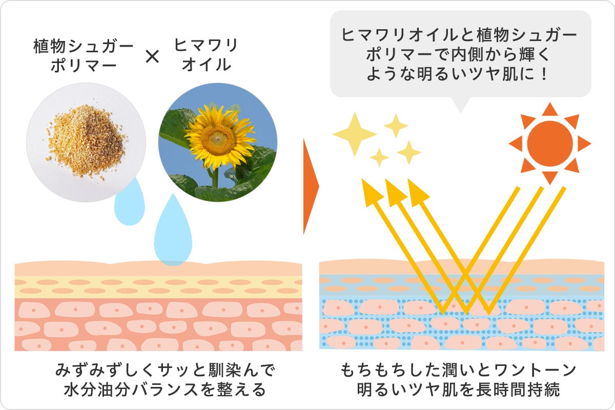 さらにヒマワリオイル配合で、水分油分バランスを整え、もちもちとした潤いとワントーンあかるいツヤ肌を長時間保ちます。