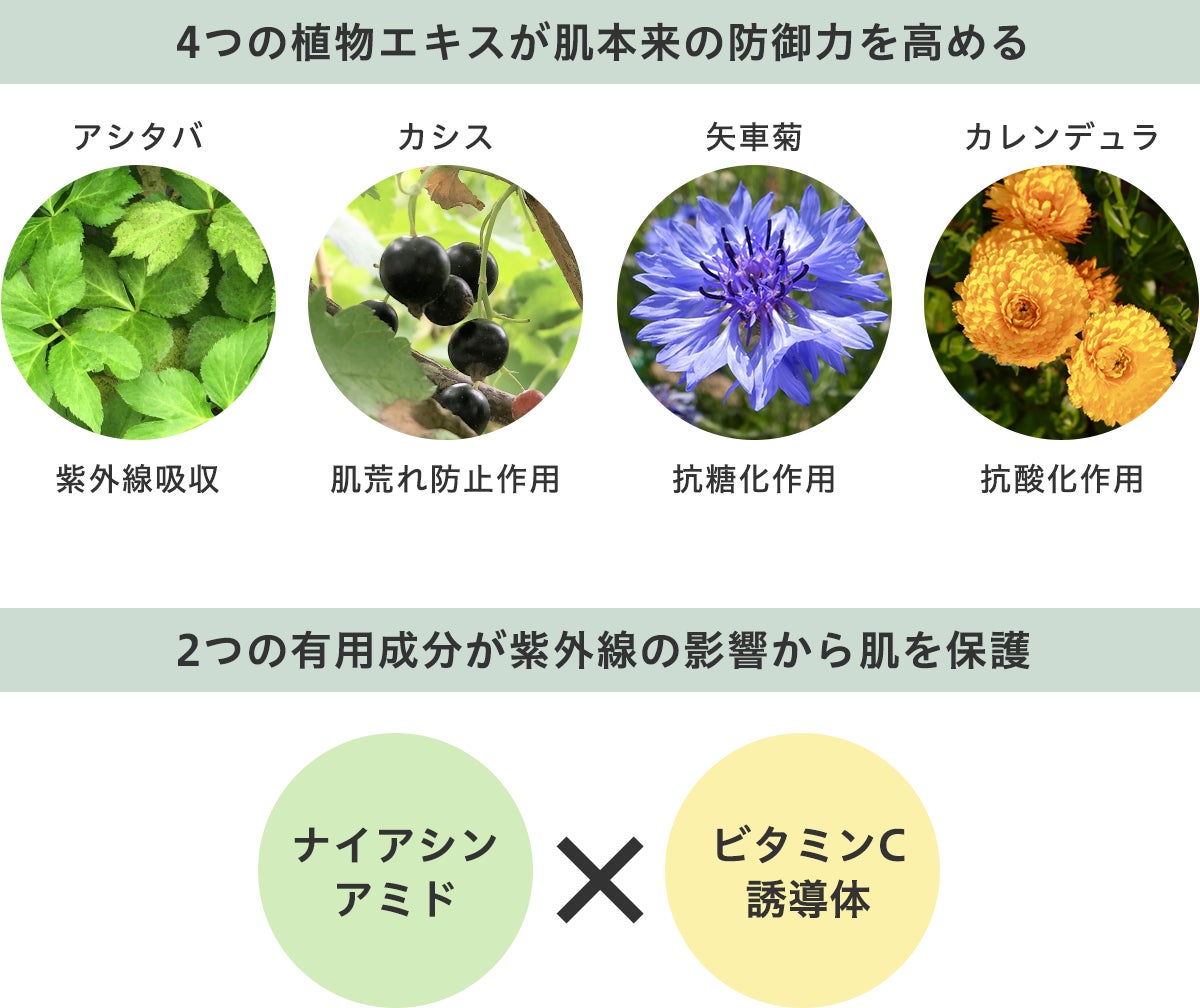 キー成分「肌本来の防御力を高める4つの植物エキス&ナイアシンアミド×VC」