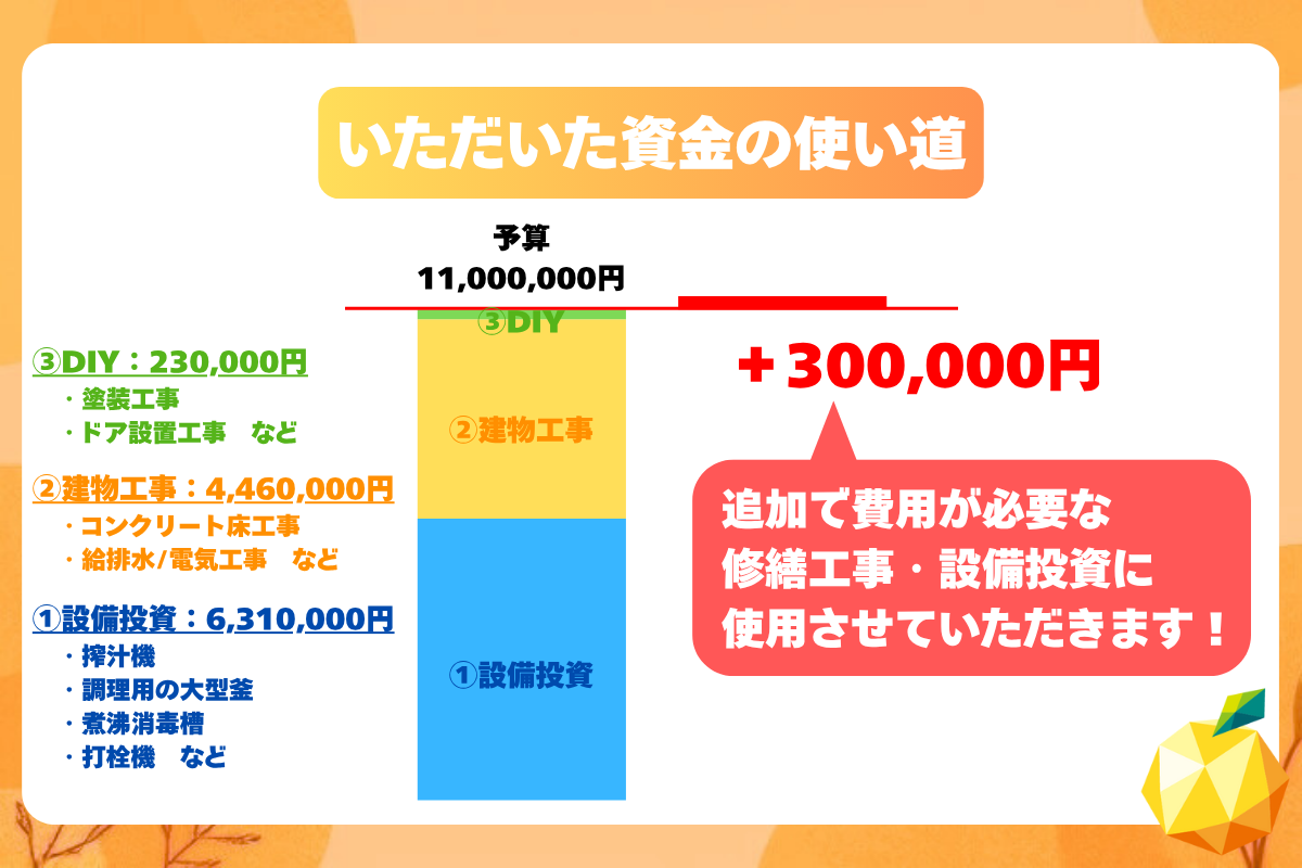 とはいえ、ジュース加工施設を立ち上げるという本計画は、総額11,000,000円という大きなお金を投資するプロジェクトです。