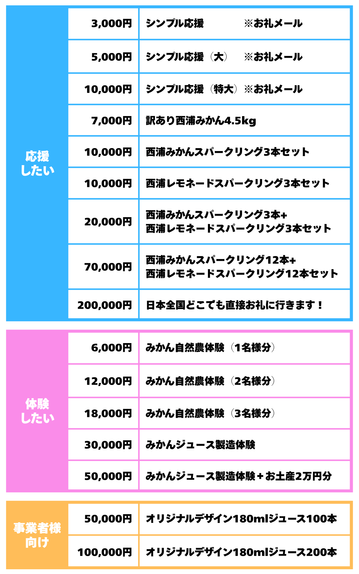 もちろん、「遠方だから気軽に現地には行けないよ…」という方や、「少額なら支援してもいいかな…」という方が選びやすいリターンもございます!