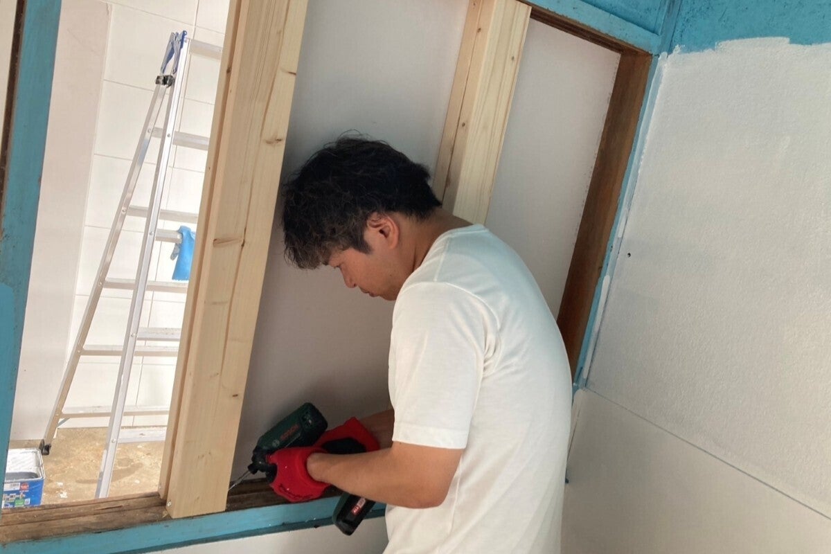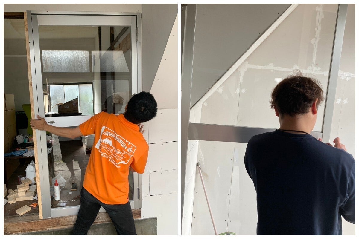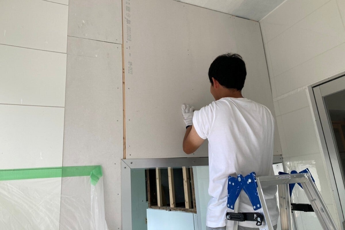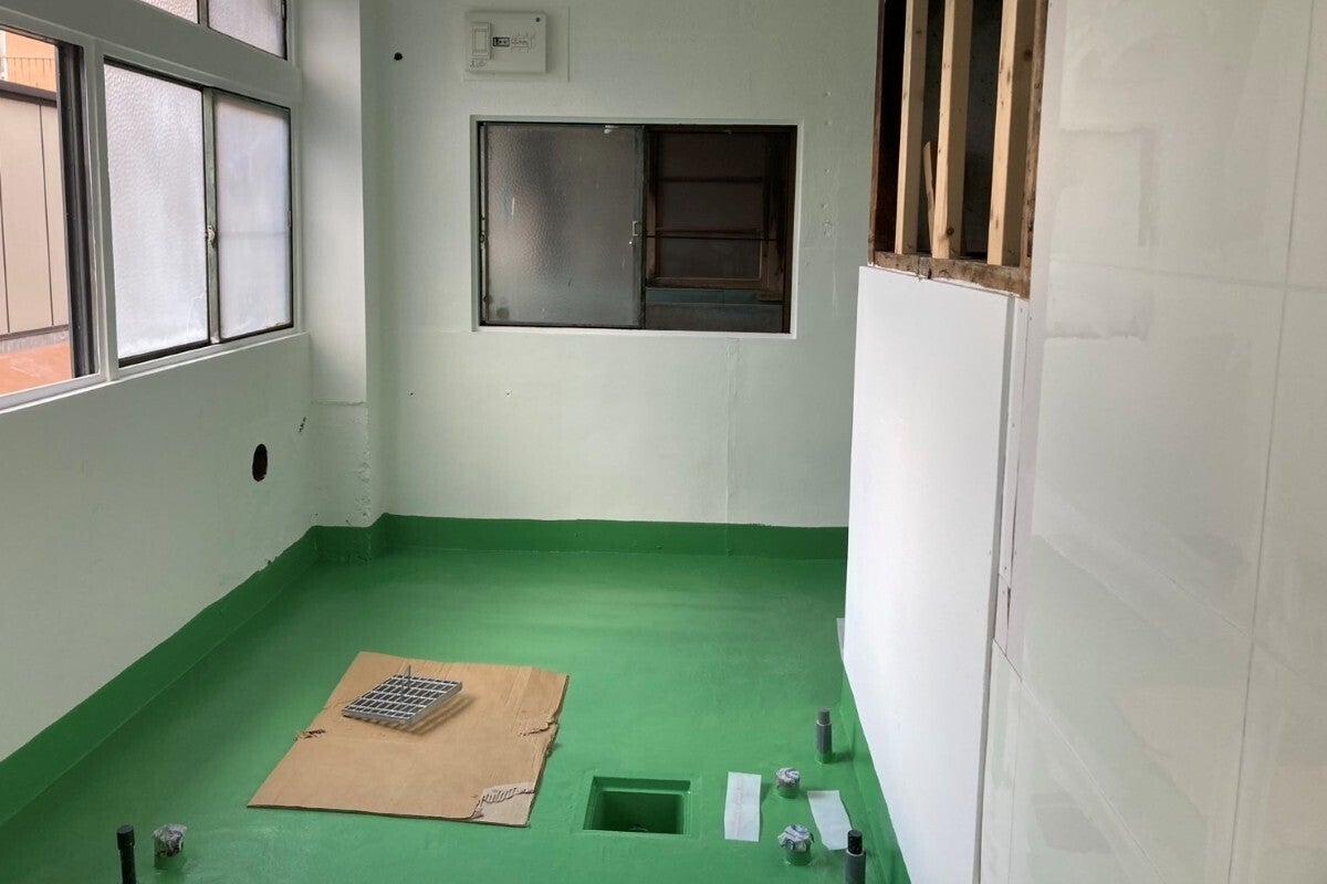 防水パネルの貼り付けや壁の再塗装、ドアの取り付けなど、自分でできる範囲の改修は、可能な限りDIYで実施しました。