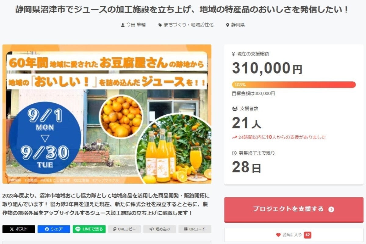 私は現在、静岡県沼津市の西浦地区という場所で、新たに果物ジュースの加工施設を立ち上げるために奮闘しています。
