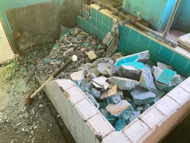このコンクリート槽は水を張ってお豆腐を浮かべている場所でしたが、不必要なものになるのでハンマーを使って破壊。