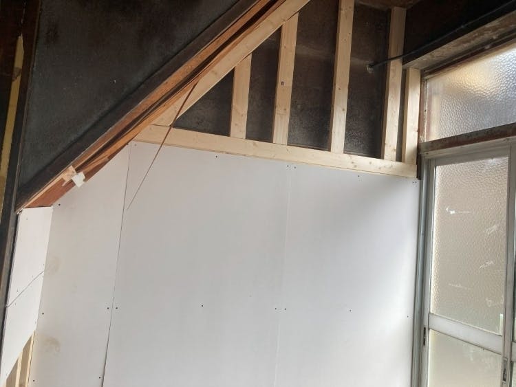 加工施設のレイアウト上、これまで扉や窓があった箇所の大部分は壁にする必要があり、ホームセンターで木材とボードを買ってきて壁を作りました。