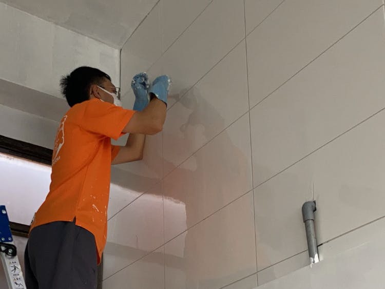 というわけで、壁に防水パネルを貼って、すき間を目地埋め材で埋めていきます。