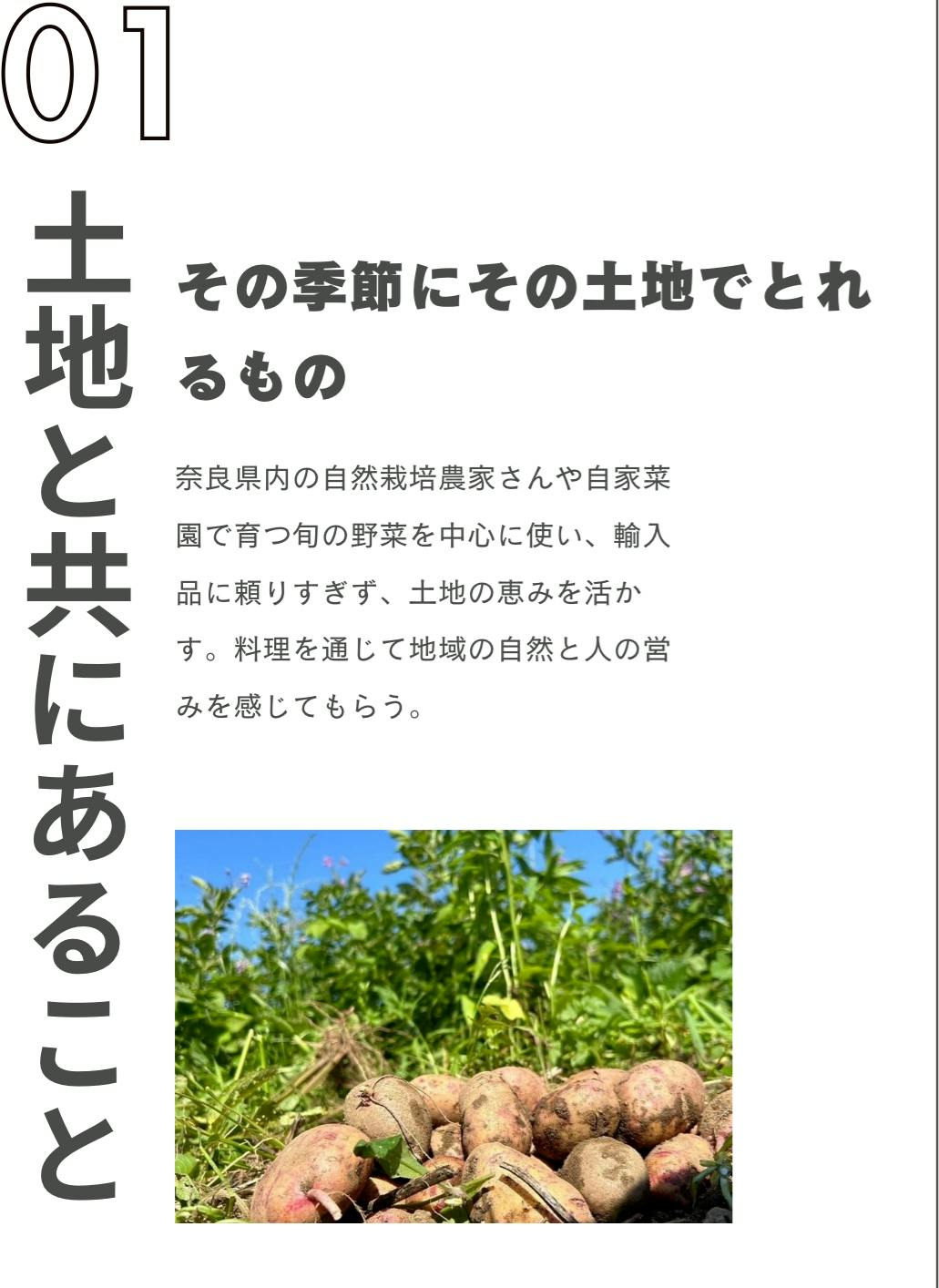 ・地元・奈良で育った旬の食材や、自らの畑で育てた野菜をふんだんに使った料理を提供する