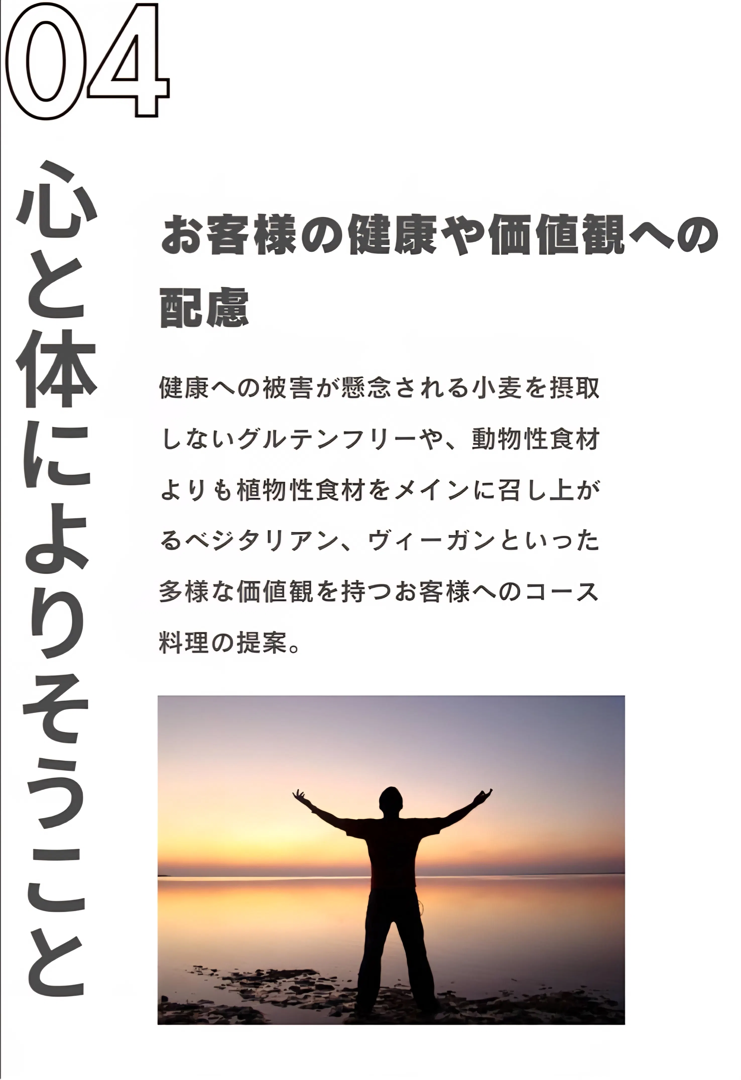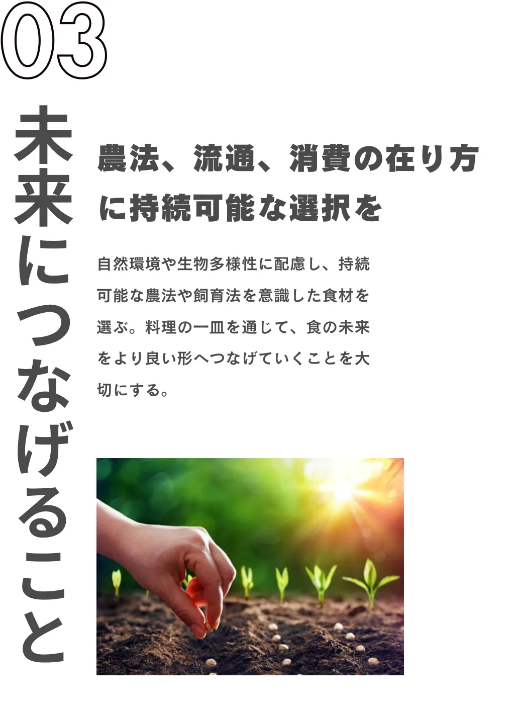 地元の素材、持続可能性、健康への配慮を重視することです。
