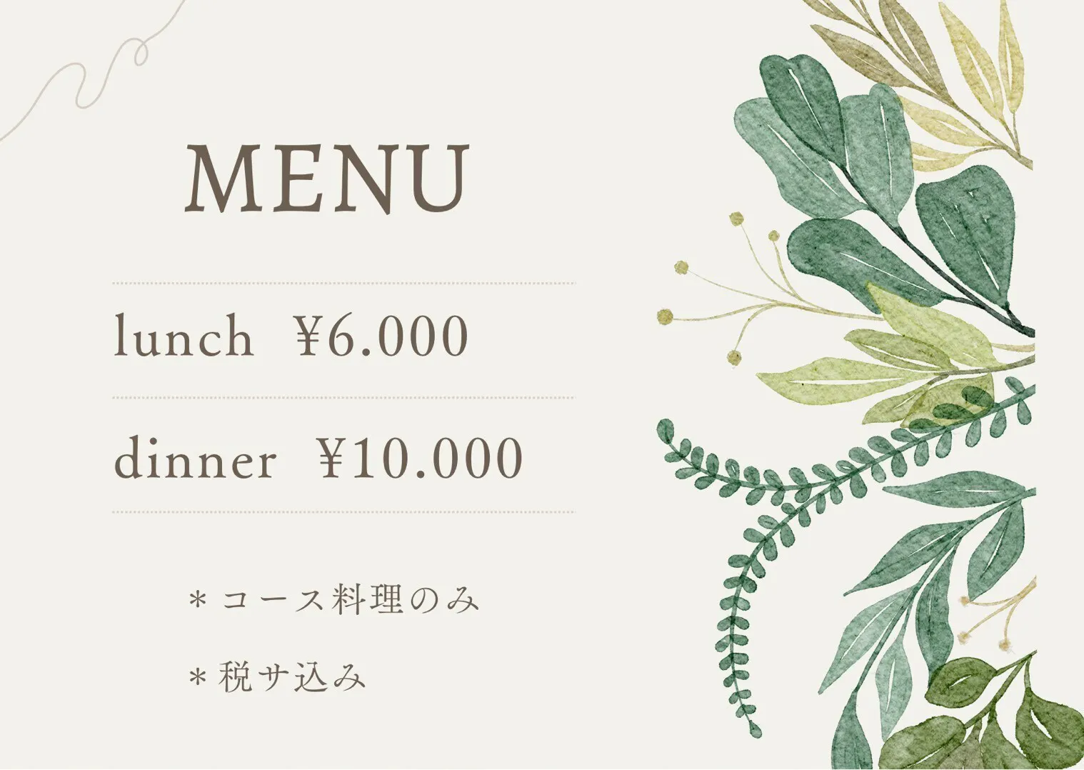 【ディナーコース1名様】の場合、支援額9000円で通常10000円のコースを召し上がっていただけます。