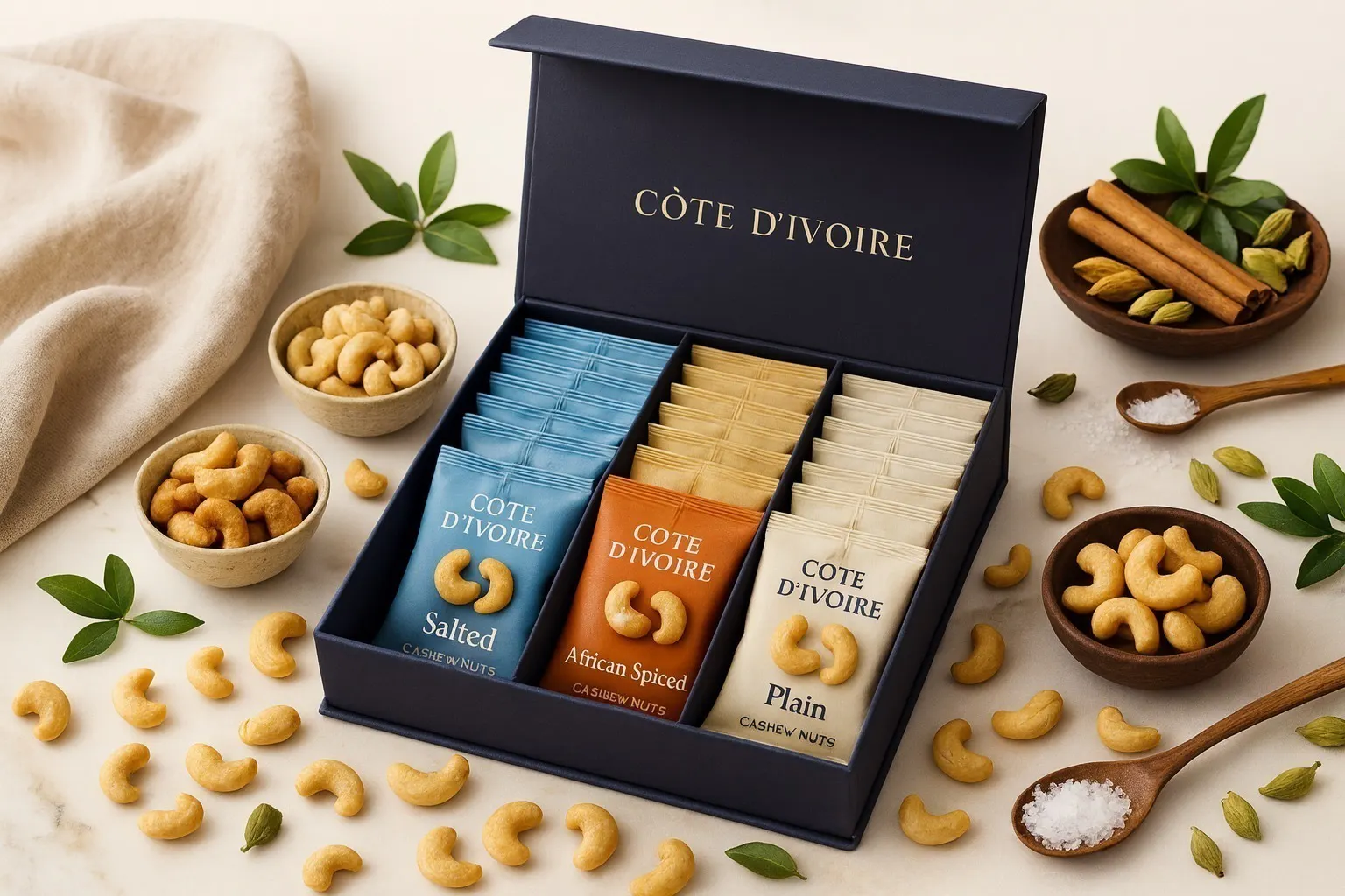 ・無選別カシューナッツギフト BOX×25セット 特別アフリカンギフト付き(ギフトはお任せ) (1セットに20g入り36袋入り・自社ロゴ入りも可)