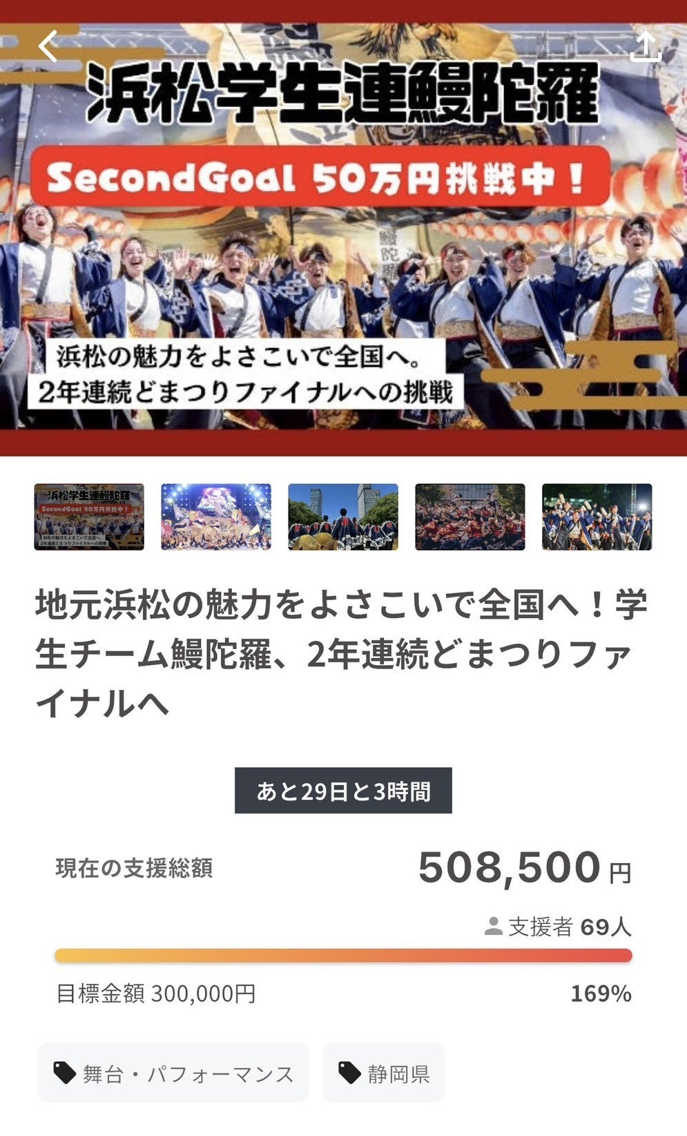 ご覧いただきありがとうございます。浜松学生連鰻陀羅(まんだら)です。本日SecondGoalの50万円を達成いたしました!!ご支援・拡散いただき本当にありがとうございます。クラウドファンディング開始から約1週間でこれだけたくさんのご支援がいただけたこと鰻陀羅一同大変嬉しく思います。また温かい応援コメントをしてくださり、ありがとうございます。とても励みになっております。沢山の方が鰻陀羅のことを知ってくださっていて、応援してくださっているのだなと実感しました。現在、現役メンバーへの振り入れが終わり、新入生獲得のための新入生歓迎会にむけて準備を進めております。新メンバー70人獲得し、最高な演舞をお届けできるよう鰻陀羅一同全力を尽くしてまいります。本日SecondGoalの50万円を達成しましたが、私たちが掲げているFinalGoalは100万円です。最高な演舞を妥協せずお届けしたい。そのために皆様のお力が必要です。FinalGoal100万円達成のため、応援のほどよろしくお願いします!