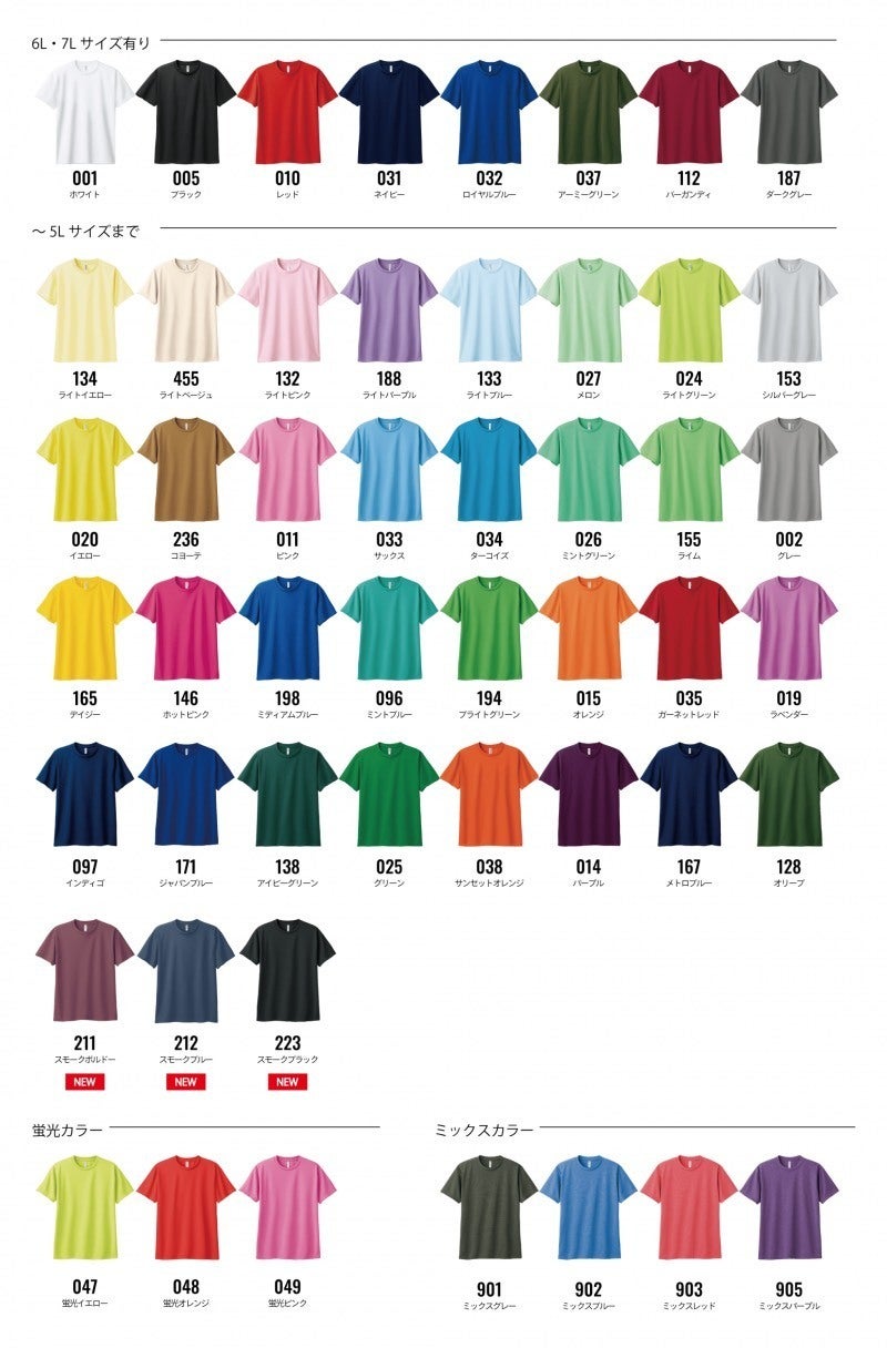 ※Tシャツ本体カラー(上記写真の色番号)、サイズ(100~7L)、文字色(金・銀・黒・白)は上の写真を参照いただき必ず備考欄にご記入ください。