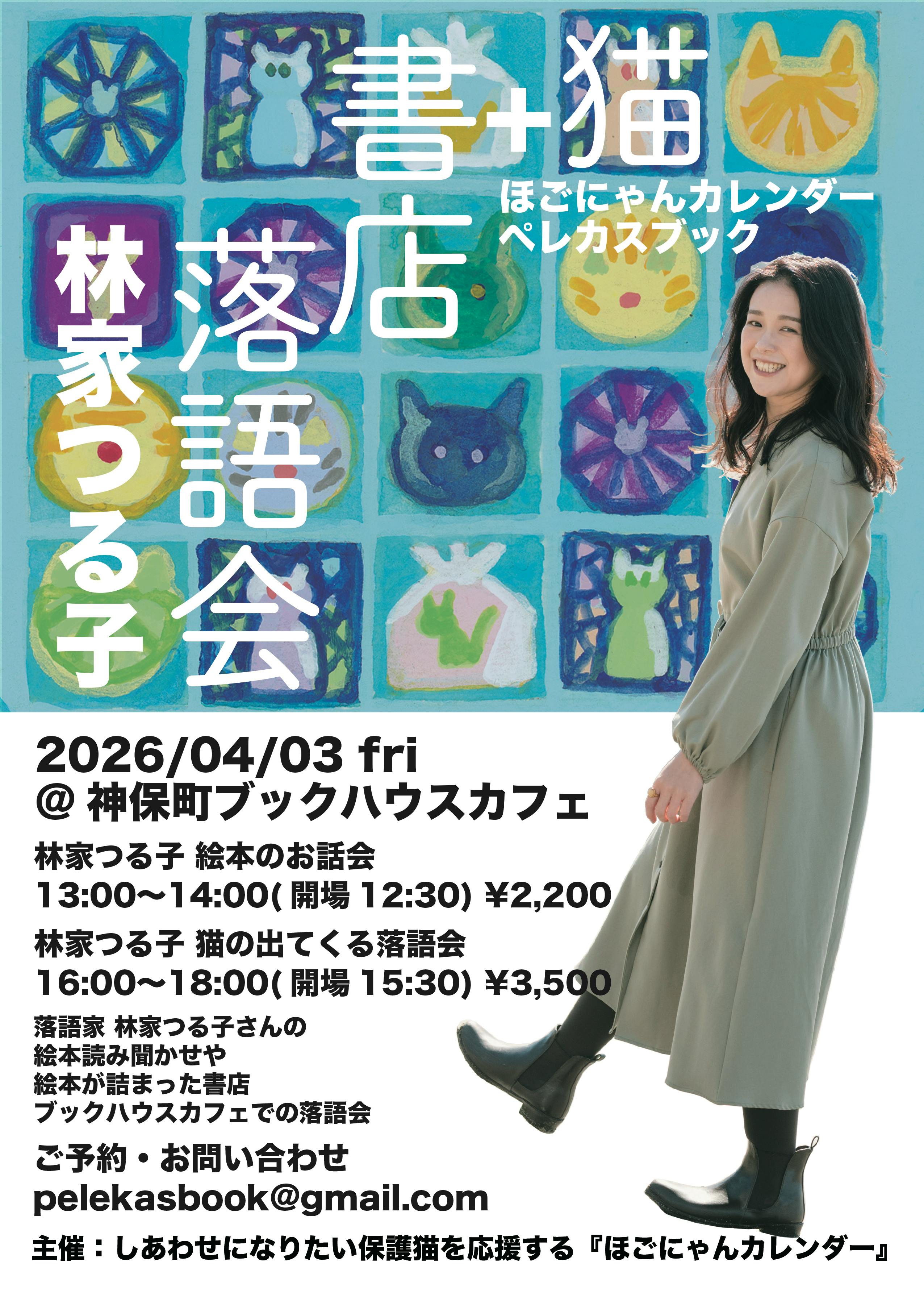 2026/03/03 17:15こんにちは。ほごにゃんカレンダーです。『ほごにゃんカレンダー』初のイベントのお知らせです。2026/04/03金曜日神保町 @ブックハウスカフェ落語家の #林家つる子 師匠をお招きしてのイベント。絵本の読み聞かせや落語会を楽しみませんか?。『ほごにゃんカレンダー』にご参加、ご購入された皆様にはクローズの会として当日『猫のランチ会』『猫のBar』を開催いたします。『猫のランチ会』は猫と犬の幸せを願う皆さんの交流会。『猫のBar』は林家つる子師匠も参加して、絵本が詰まった『ブックハウスカフェ』でちょっと大人の交流会です。お友達を誘ってのご参加もいただけますので、是非遊びに来てください。。つる子師匠とのご縁は、ペレカスブックの実店舗があった時代に、年に3,4回独演会をしていただいていて。猫の出てくる落語をしていただいたり、一緒に落語の紙ものなどを作ったりしてきたのです。今回師匠が『ほごにゃんカレンダー』にもご賛同してくださり、こんなイベントをする運びになりました。保護猫や保護犬のしあわせを願いながら、本屋さんで絵本や落語を楽しむ。落語好きも本好きさんも、犬や猫を好きなかたも、是非ご参加ください。お問い合わせはDMかメールにてお気軽にどうぞ!pelekasbook@gmail.com。ずっとの家族と生きた時間愛された記憶を絵本作家が描きますカレンダーが生む支援は里親を待つ保護猫たちが『ずっとの家族』に出会うための生活支援に使われます。しあわせになった保護猫からしあわせになりたい保護猫への『命のバトン』カレンダー1部の売り上げから保護猫に充分な栄養のあるフード20日分が寄贈されますそれが『ほごにゃんカレンダー』です。。2026/03/03#ほごにゃんカレンダー#hogonyan_22#pelekasbook もっと見る