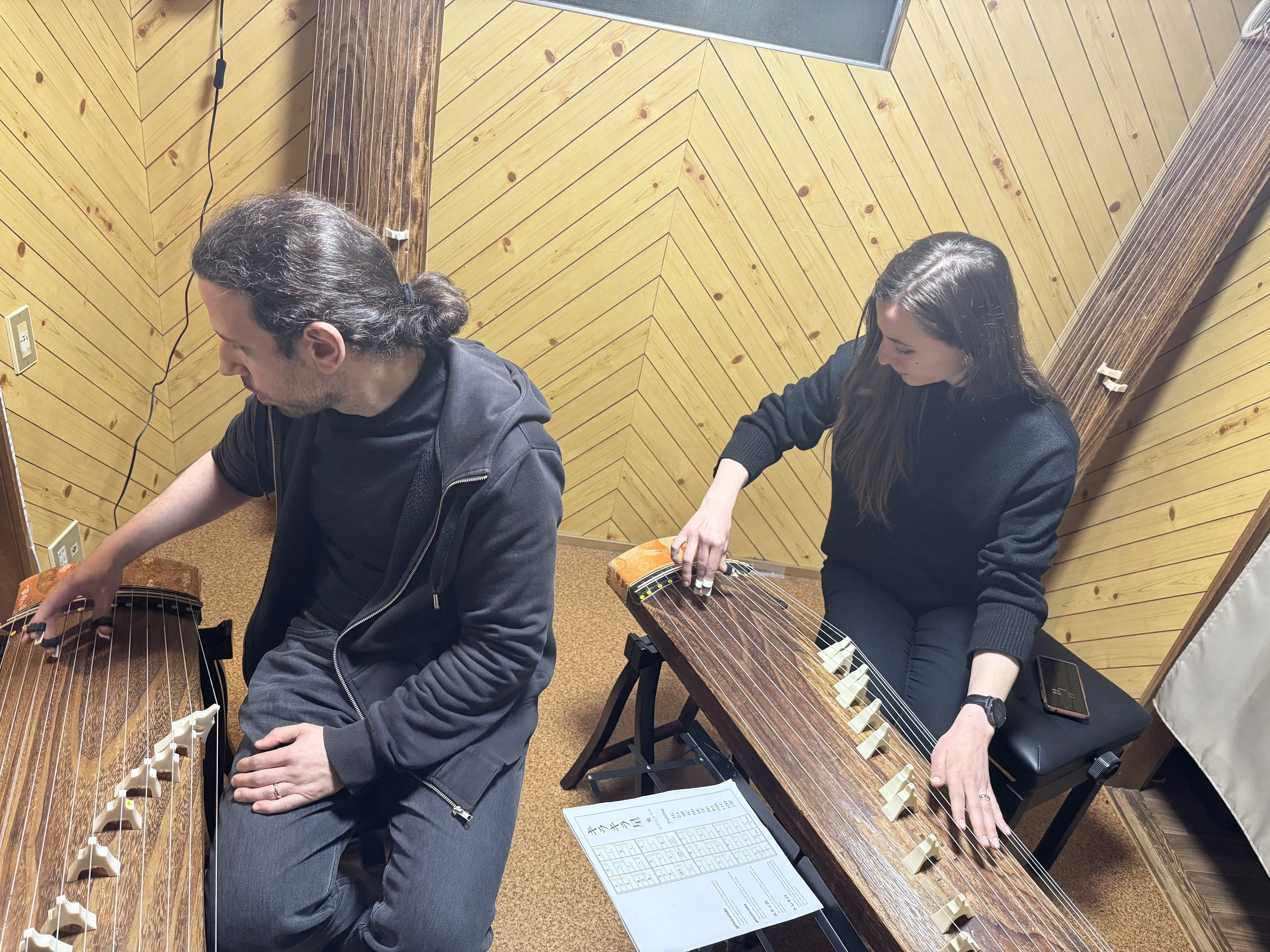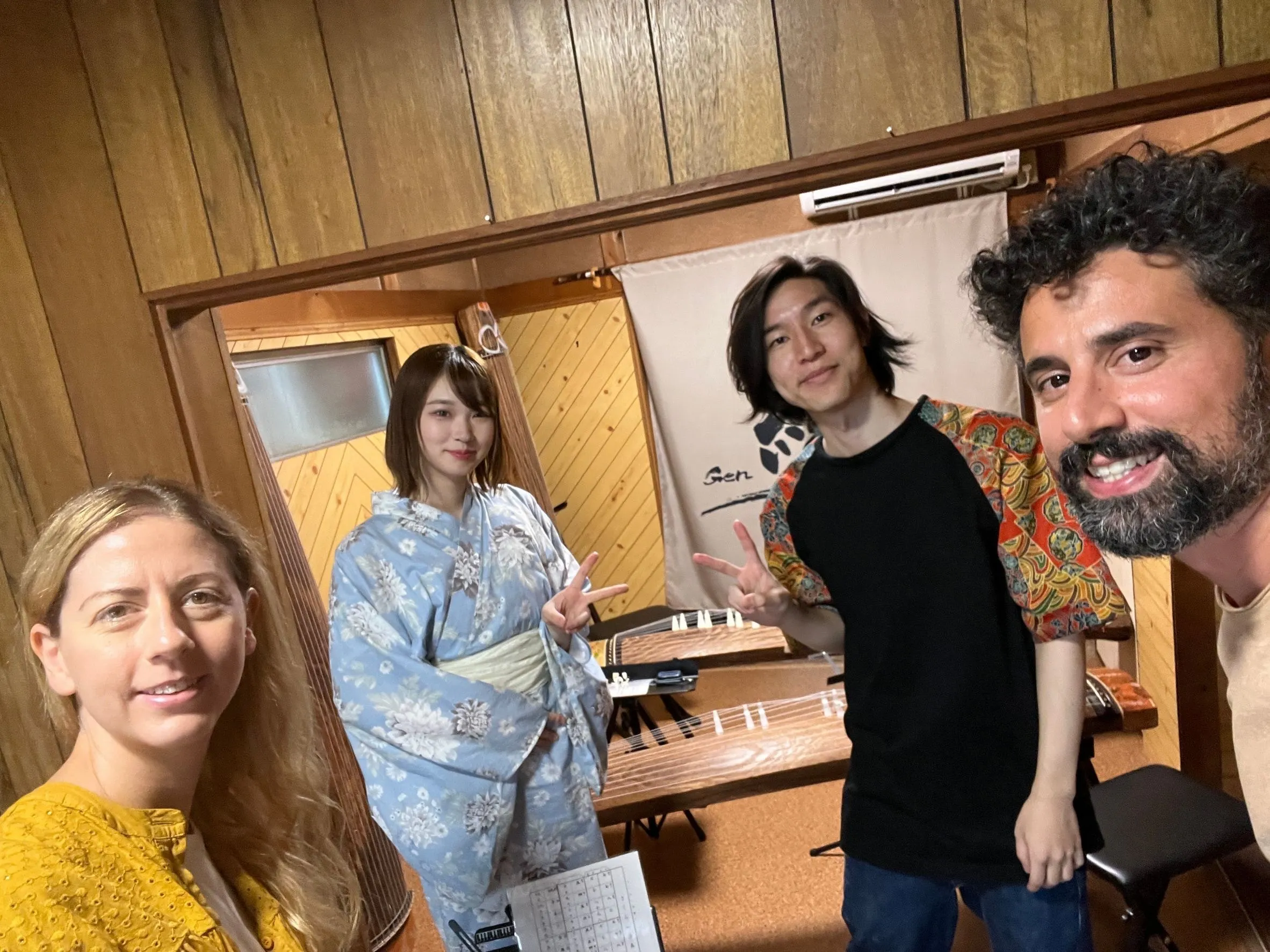 「絃 故郷 西院」でのルーマニアからのご夫婦への箏の体験レッスン