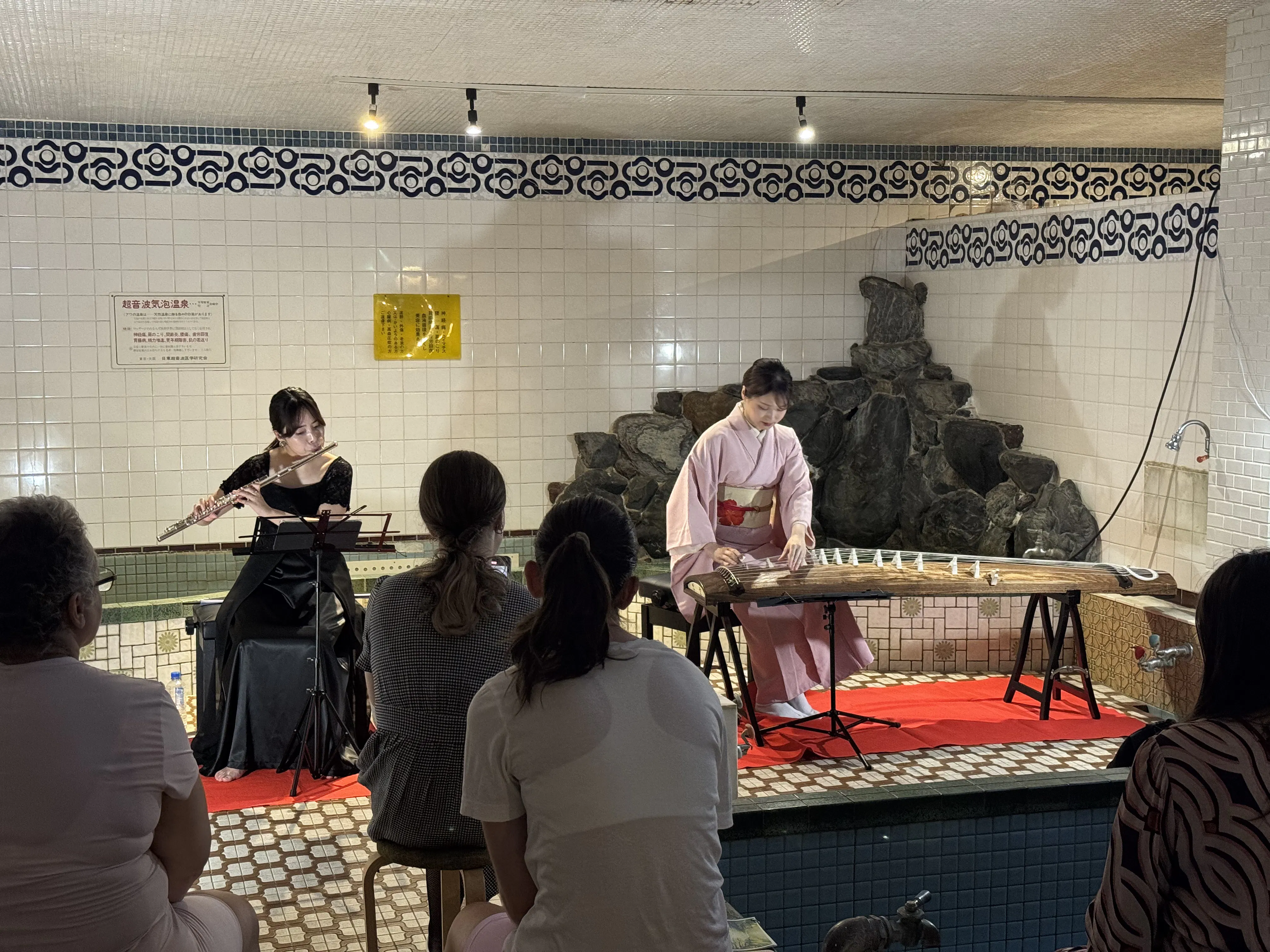 「絃 湯響 九条湯」での田平 莉子(左:フルート)とFU-RAN(右:箏)による箏の演奏
