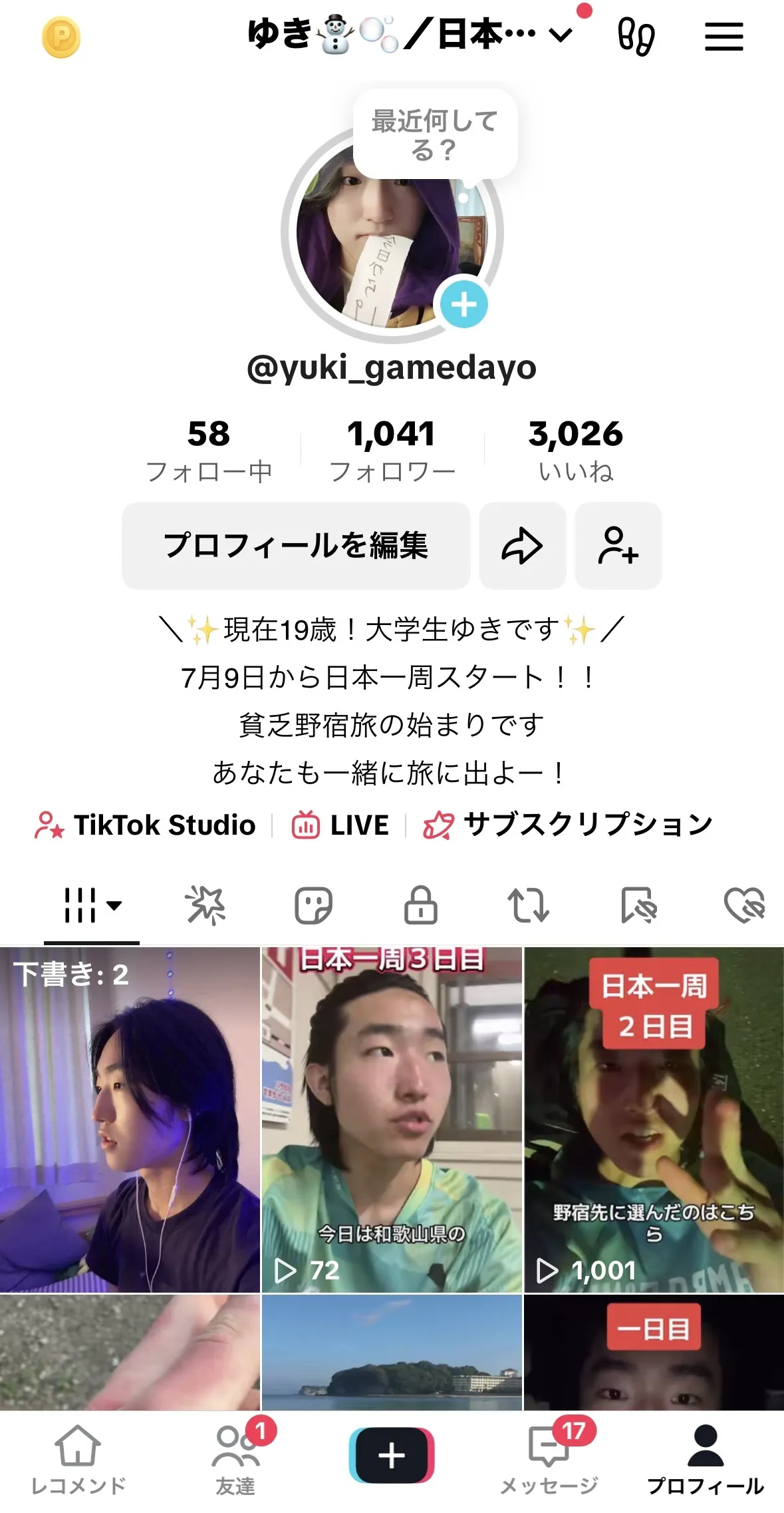 ライブ配信をしながら旅をすることは元々決めていたので、認知拡大のために半年ほど前からライブ配信や、TikTokでの動画投稿などを始めました。