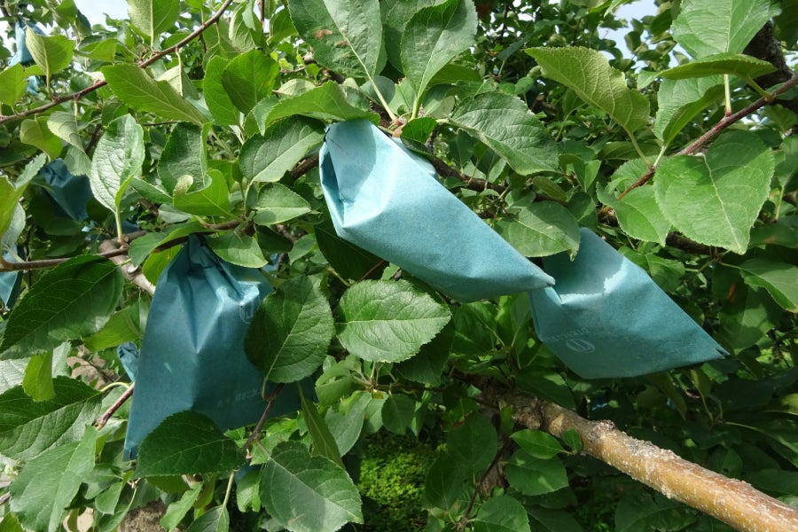 一般的なりんご栽培では、見た目や品質を均一に保つために「袋かけ」 という方法が用いられます。これは、果実を雨や病害から守り、色づきをコントロールするための伝統的な栽培法。