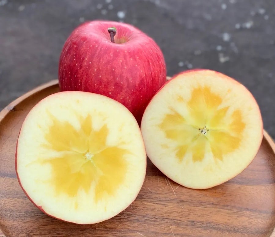 サンふじ特有の「蜜(みつ)」は、果実がしっかり熟した証として自然に現れるもののため、蜜の入り方や量には個体差がございます。事前にご了承お願いいたします。
