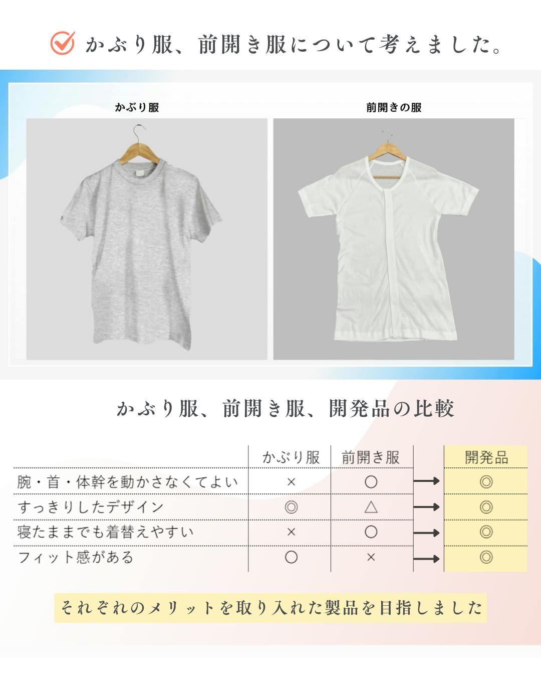 現状の選択肢は、かぶり服または前開き服です。それぞれのメリットを活かしつつ、デメリットは改善した肌着を作れないかを考えました。