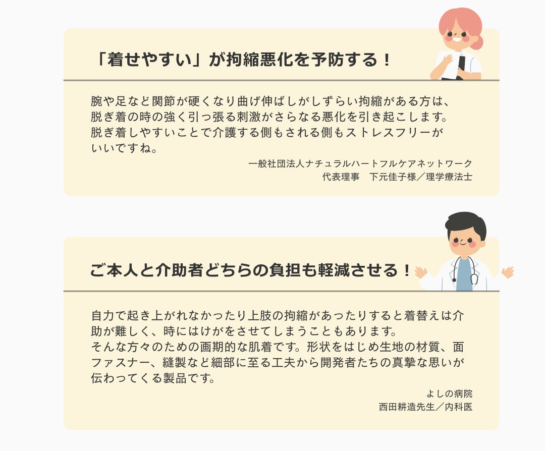この製品であれば、その問題は解決します。製品の一番の特長は、関節への負担を考え、アームホールをなくしたところです。それにより関節への負担がかかりにくく、着脱が簡単です。