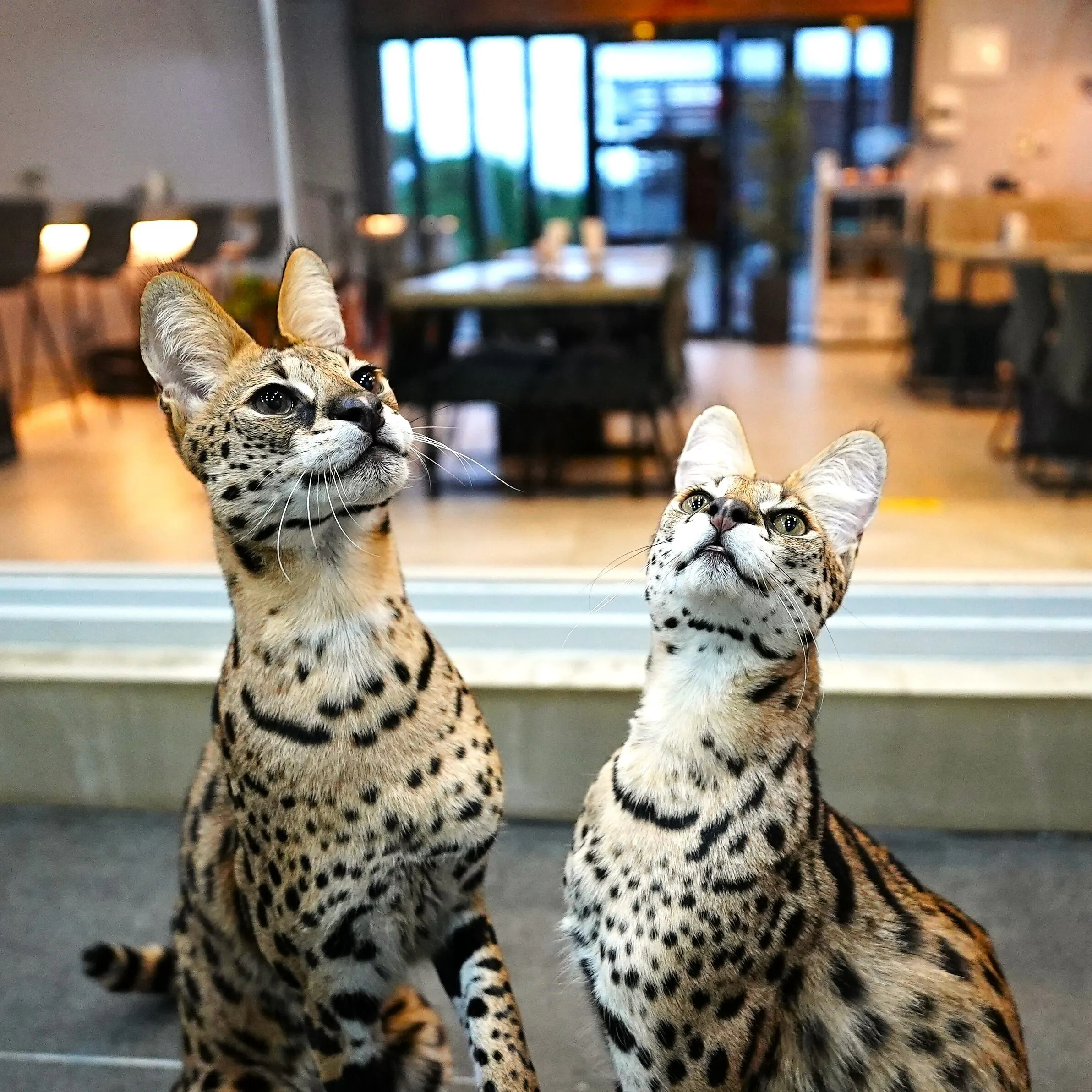 実は、私たちのカフェには2頭の特別な「保護猫」がいます。それはサーバルキャットです。