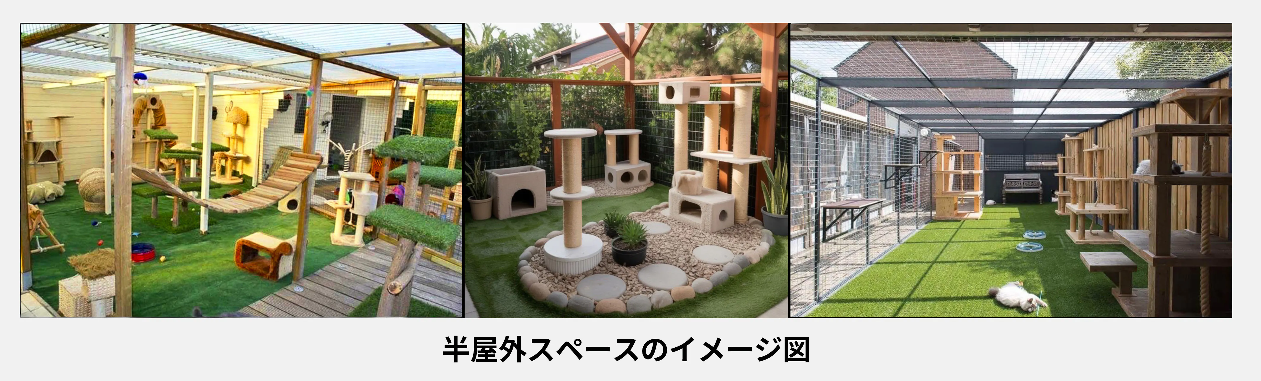 屋外の施設は7~10㎡程度あり、猫たちが色々な遊具を使って遊んだり、楽しく登ったり、走り回れる空間を作りたいと思ってます。他ではなかなか見ることができない猫たちのありのままの表情や行動に出会えます。
