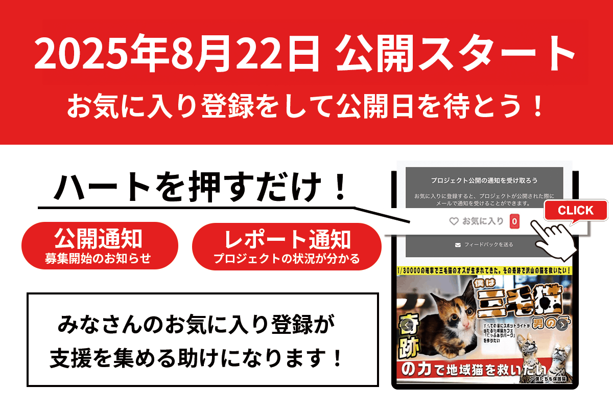 2025/10/09 14:08この度は、「にゃふぁりパークプロジェクト」のクラウドファンディングに、温かいご支援をいただき誠にありがとうございました。9月30日をもちまして、本プロジェクトのクラウドファンディングは終了いたしました。皆さまからのご支援のおかげで、合計で59万円という多大なご支援をいただくことができました。心より感謝申し上げます。目標金額には届きませんでしたが、皆さまからお預かりした大切なご支援は、にゃふぁりパークプロジェクトをスタートさせるための建物建設費用として、大切に活用させていただきます。ご支援くださった皆さまの想いを無駄にしないよう、今後もプロジェクトの実現に向けて邁進してまいります。建設準備の都合上、当初の予定より遅れが生じておりますが、今後の進捗状況は、こちらの活動報告ページにて随時ご報告いたしますので、引き続きどうぞよろしくお願い申し上げます。 もっと見る