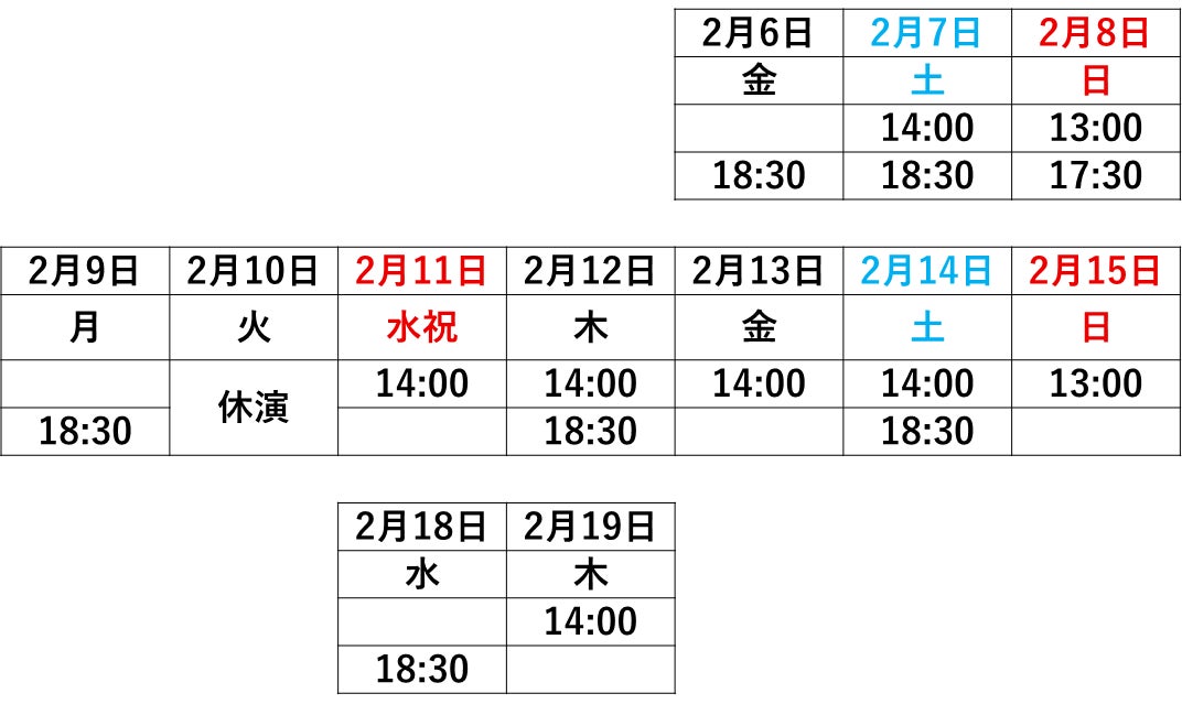 2月11日(水祝)14時 開演 or 2月13日(金)14時 開演 or 2月14日(土)14時 開演