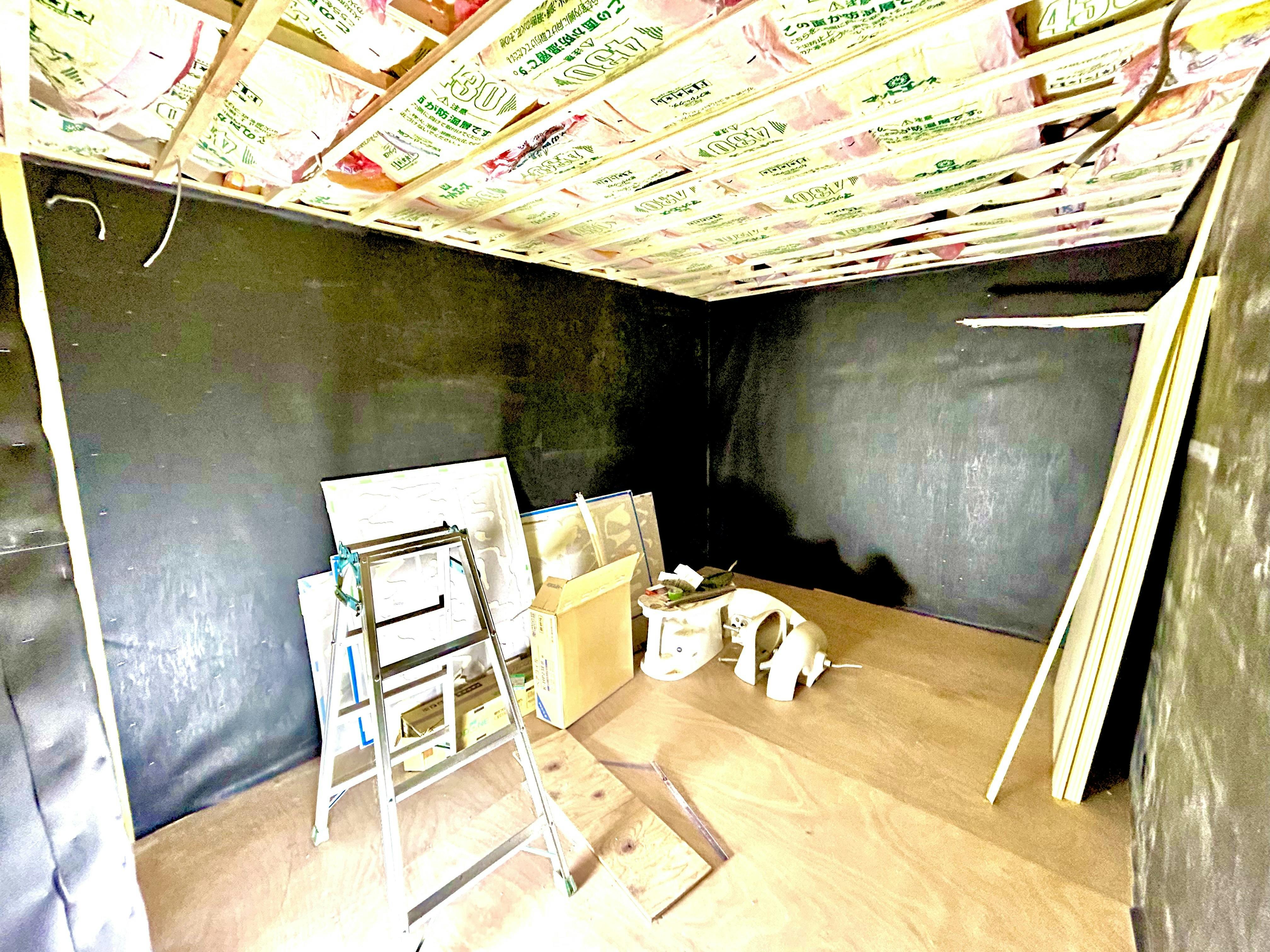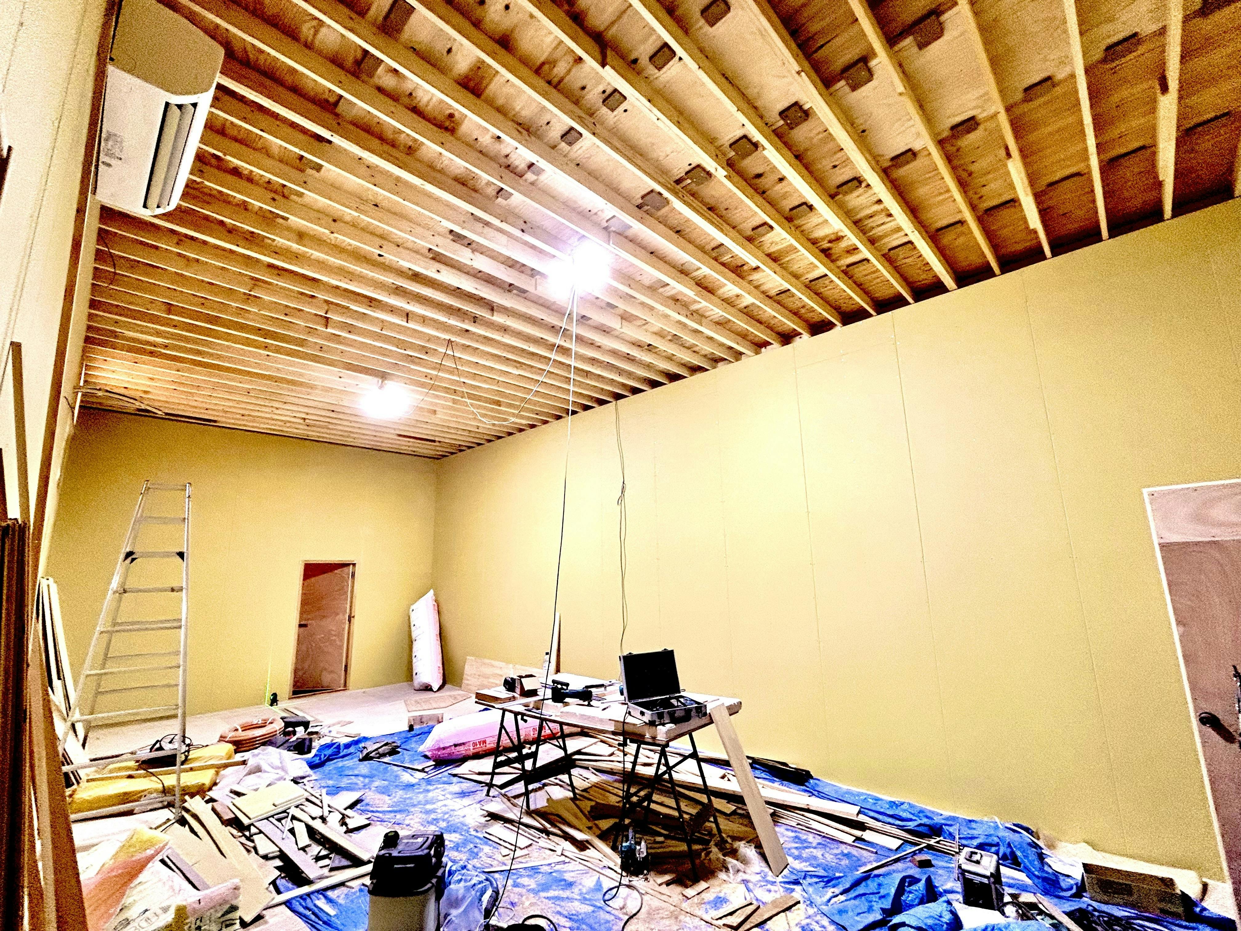 コンクリートから浮かせた床の設置や、防音仕様の壁面建造、設備の選定などなど………まさに今現在も作業に取り組んでおります。