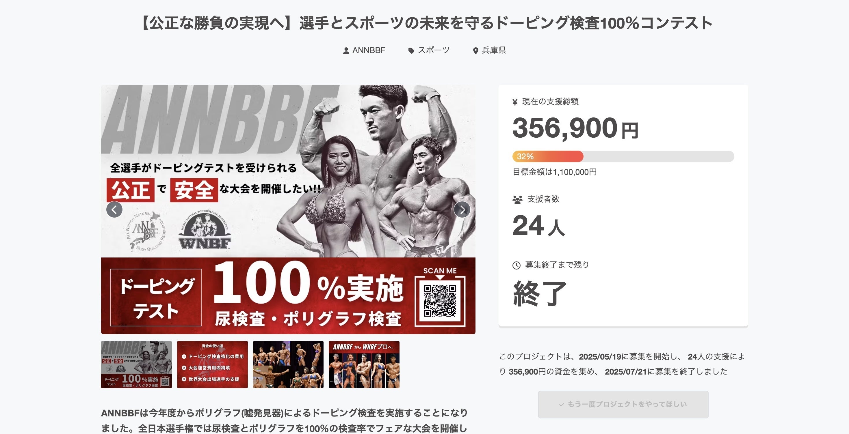 選手と運営事務局だけでドーピング検査費等の諸費用を賄うことは現実的に難しいため、プロジェクトの説明をお読みいただき、賛同いただける方はお力添えしていただければ幸いです。