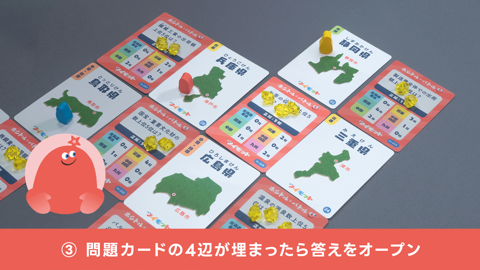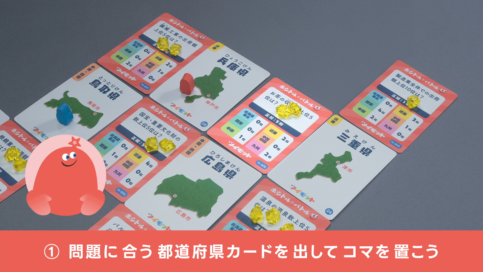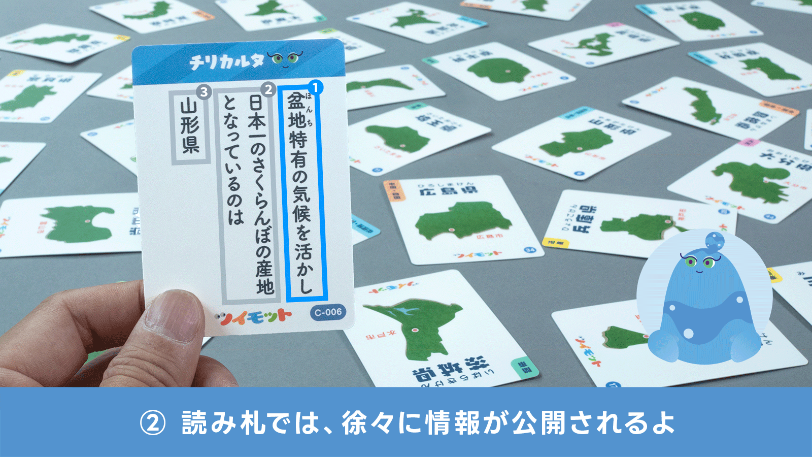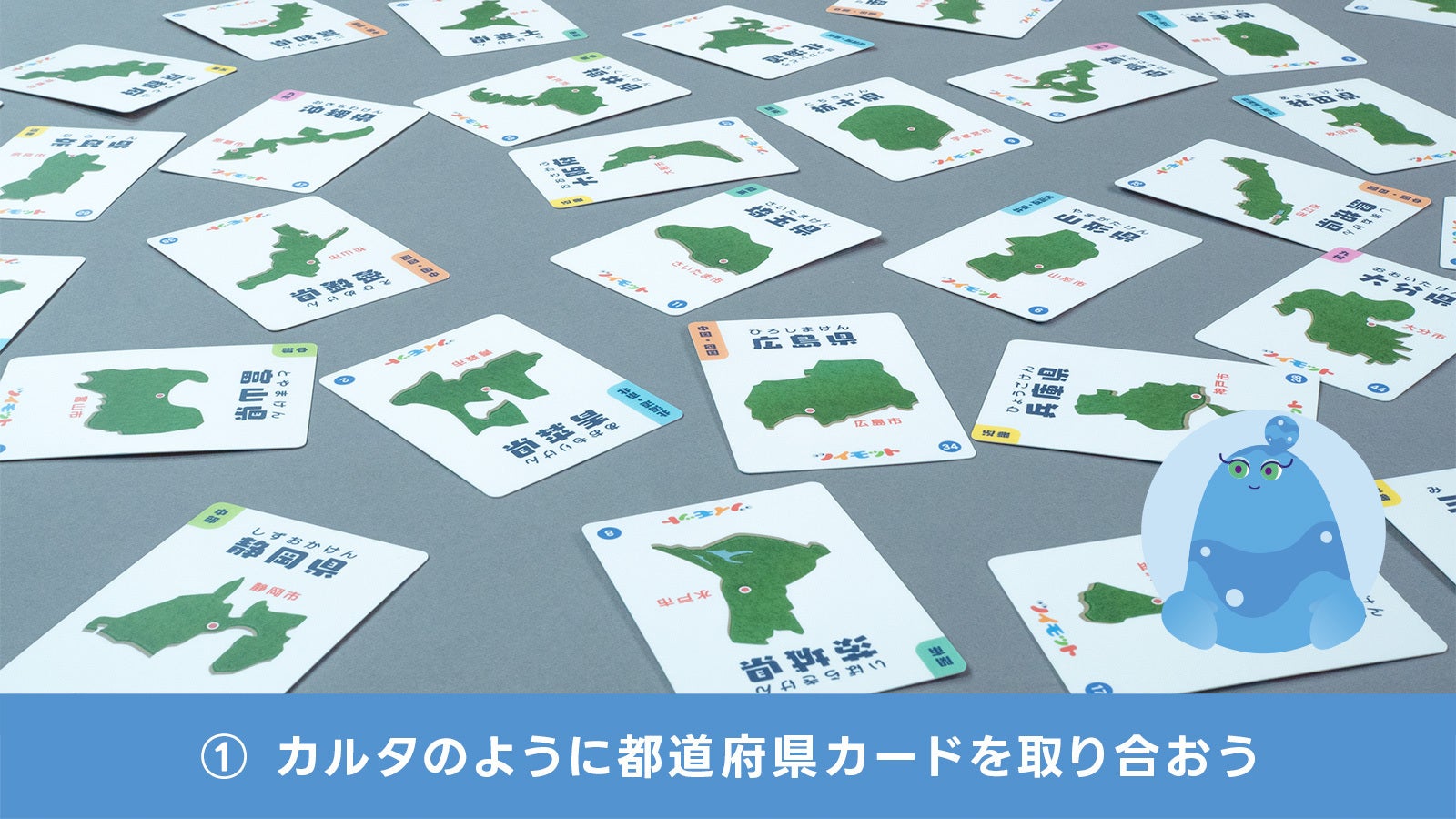 徐々に読み上げられる読み札の情報を元に、当てはまる都道府県を推理して、だれよりも早くカードをゲットしよう!