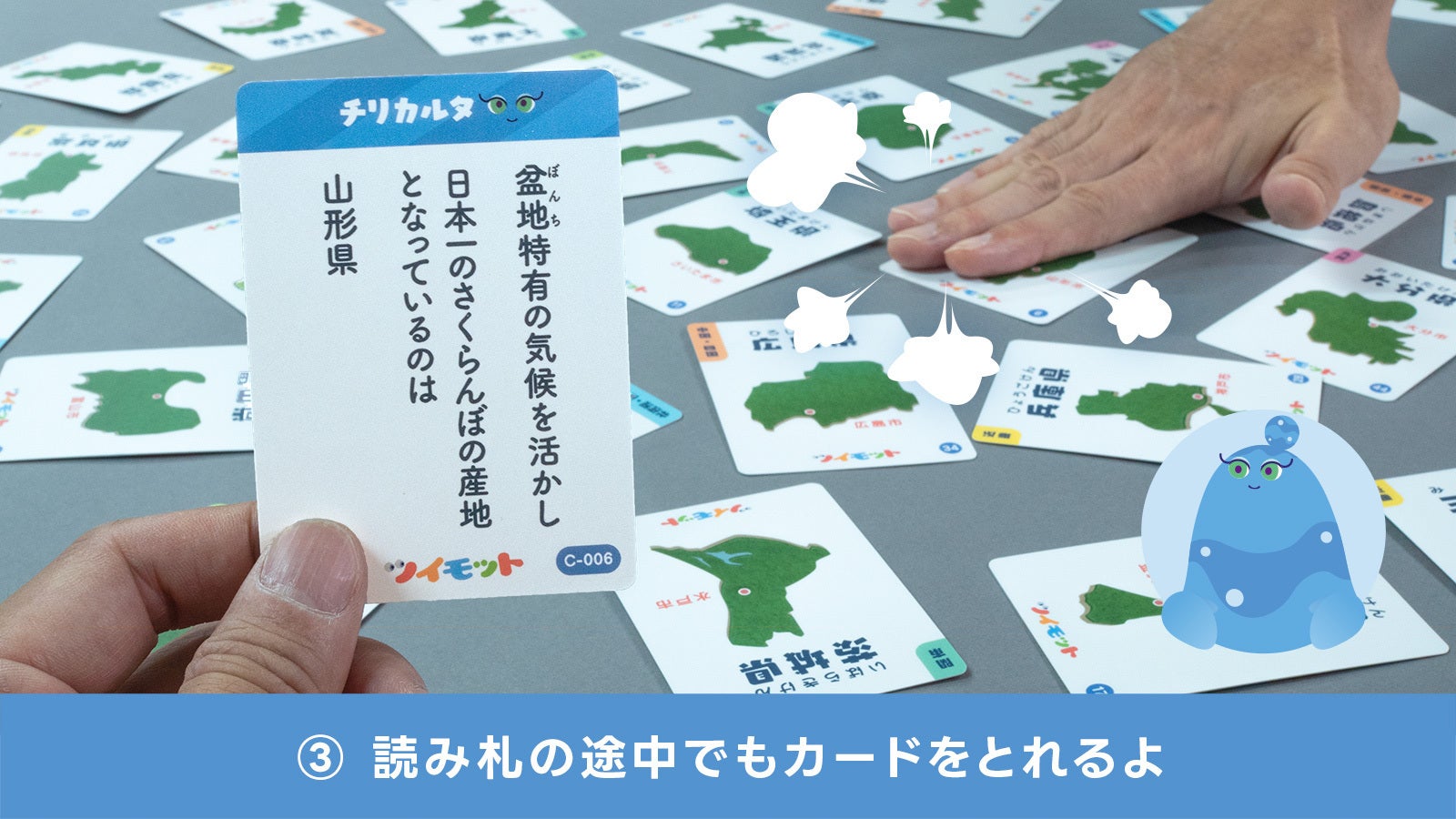『チリカルタ』は、地理に関する知識と勘を頼りに、カルタのように都道府県を取り合うゲームです。