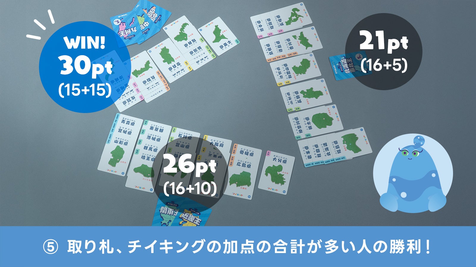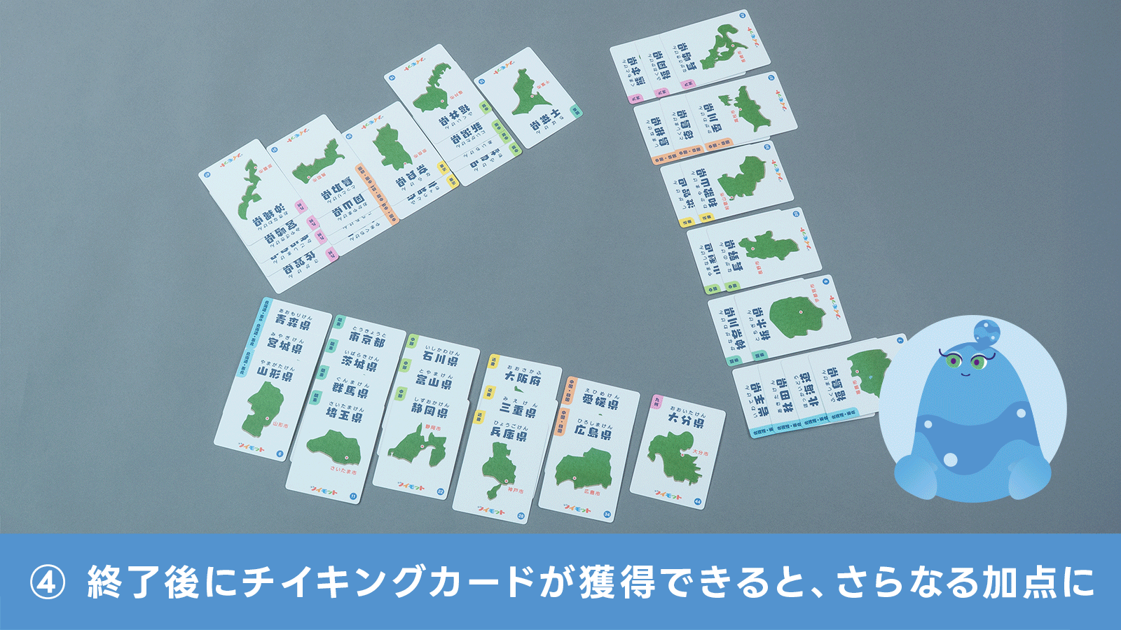 ・関東、中部、関西などの地域のカードをたくさん集めると、特別加点の“チイキング”カードを獲得できます。自分の得意な地域をしっかり覚えていくことで、ゲームを優位に進められます。