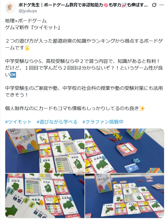 『ボードゲーム×教育』でご活躍されているボドゲ先生※にツイモットをレビューいただきました。