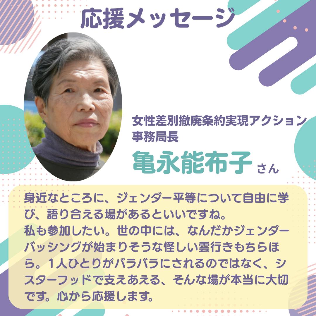 1月の連続勉強会でお話しいただく女性差別撤廃条約実現アクションから、事務局長の亀永能布子さんより応援メッセージが届きましたのでご紹介します。