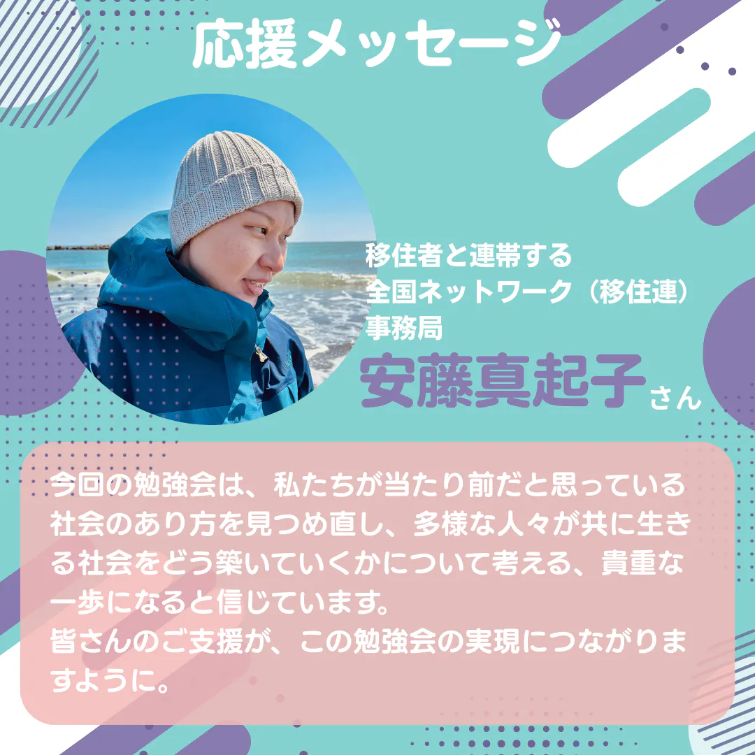 連続勉強会でお話いただく、移住者と連帯する全国ネットワーク(移住連)事務局の安藤真起子さんから応援メッセージが届いたのでご紹介します。