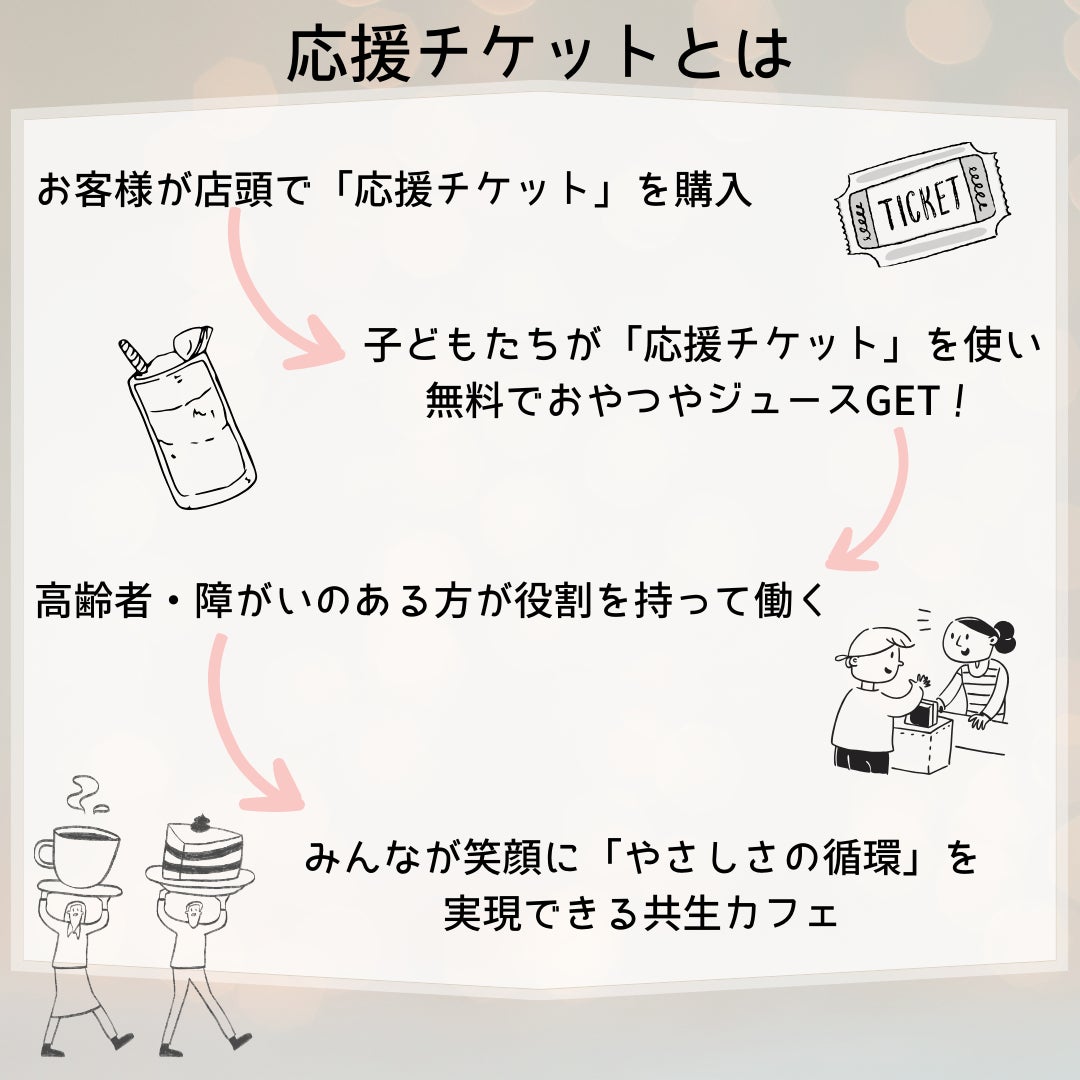 カフェに来たお客様が任意で応援チケットを購入すると、その分だけ地域の子どもたちが無料でお菓子やジュースを受け取ることができます。