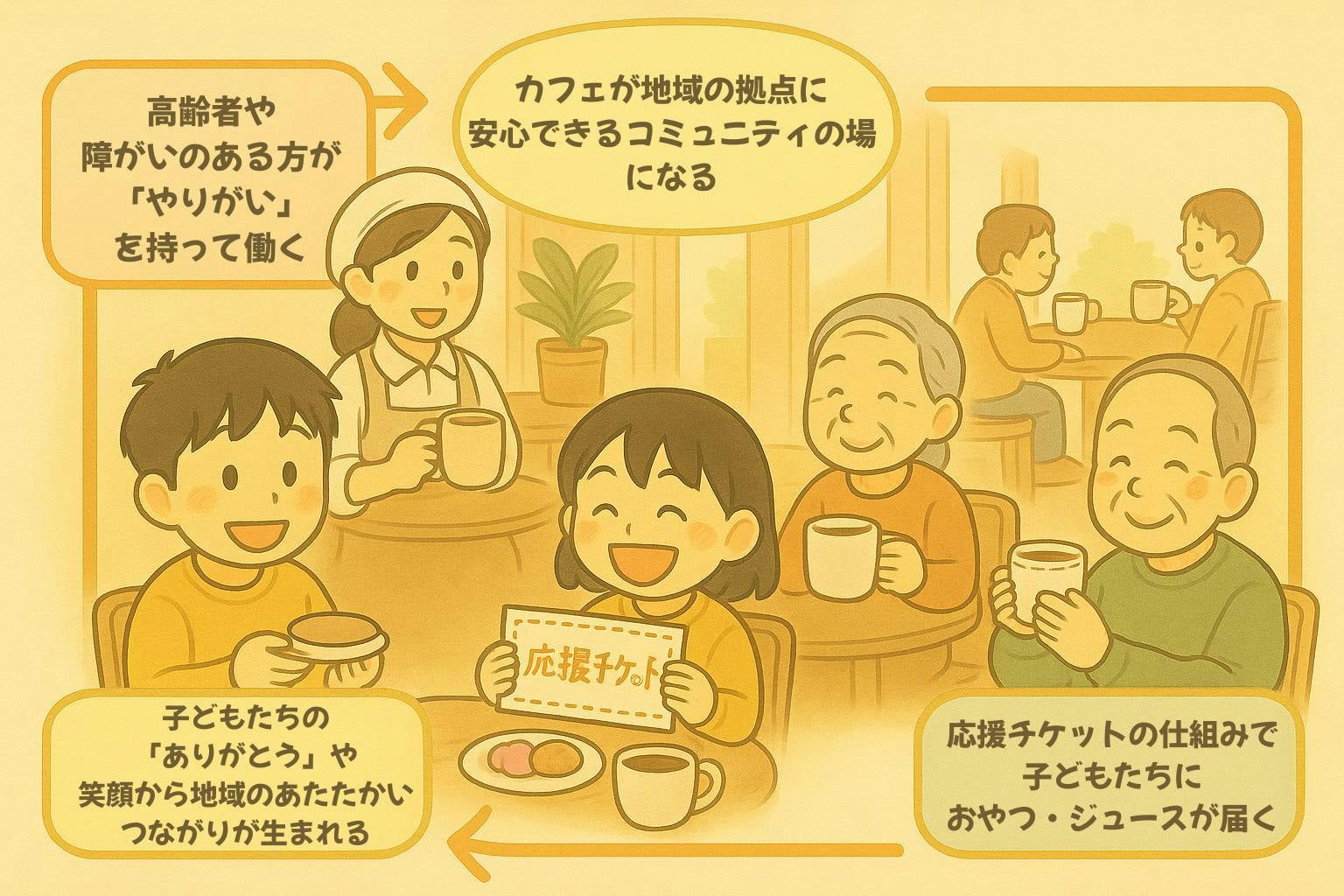 このカフェは「応援チケット」を通して、地域の子どもたちにおやつや安心を届ける仕組みを持った、地域共生の拠点です。