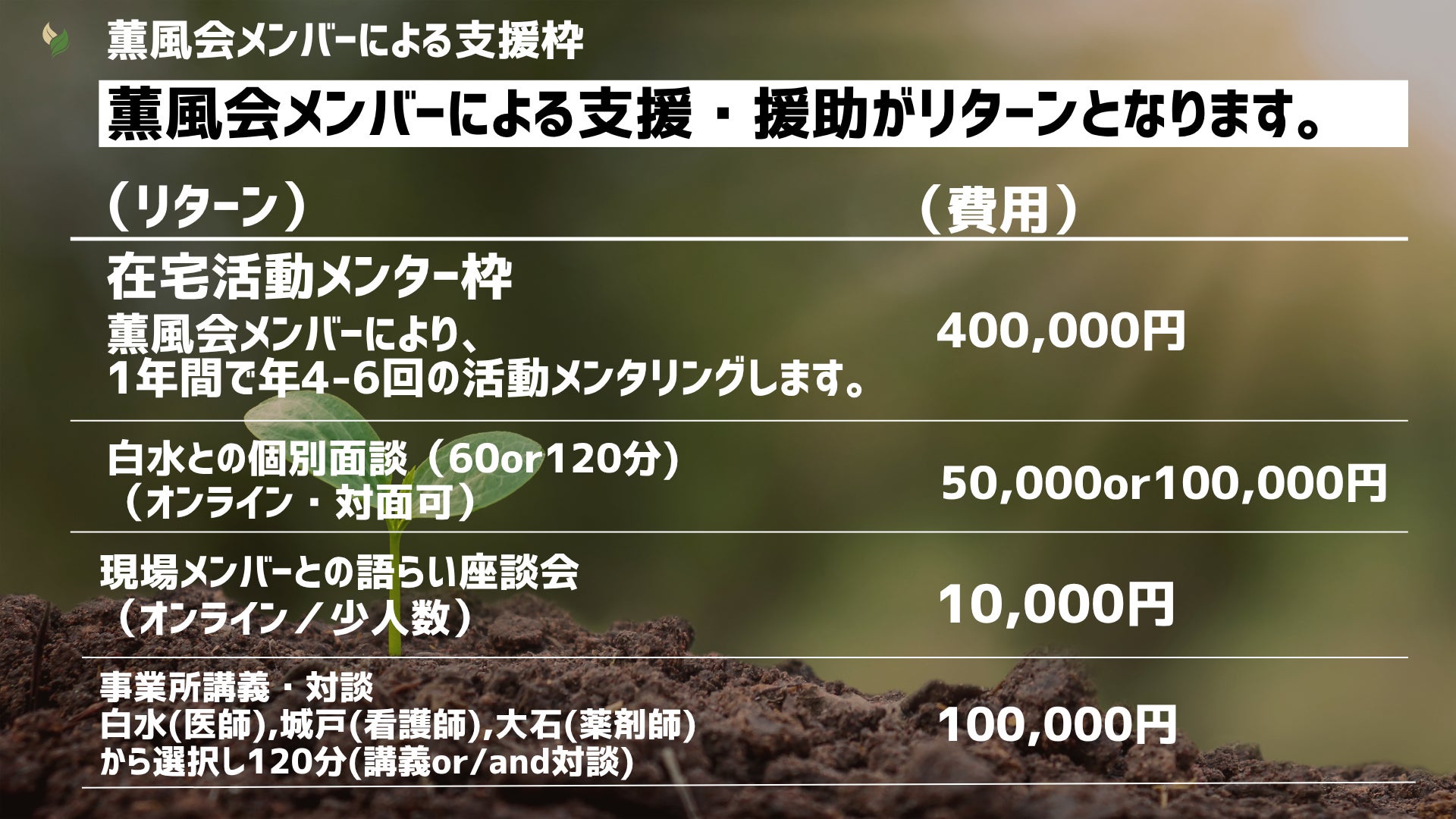 在宅メンター枠(個人・法人):薫風会メンバーが定期的にメンタリング・コンサルティング業務を行います。