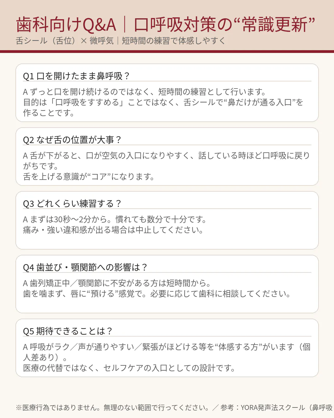 私の取り組みは医療ではなく、舌シール(舌位)と微呼気を“短時間の練習”で体感しやすくするセルフケアの入口としての設計です。