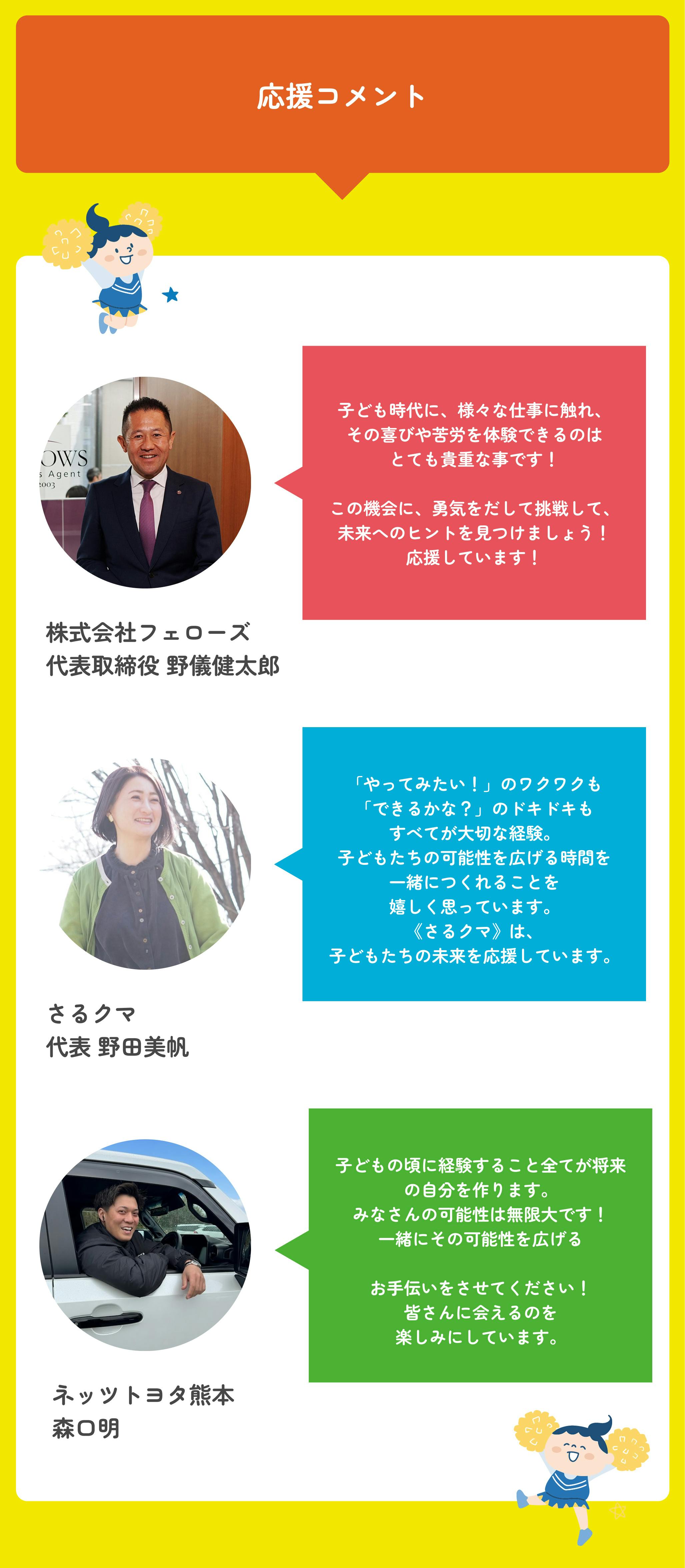 本プランは、 子ども未来キャリアDAYの取り組みを、シンプルに応援したい方のための支援プランです。 返礼品はございませんが、 イベント終了後に 感謝のお礼メールと 活動の様子が分かる活動報告書をお届けします。 いただいたご支援は、 子どもたちの体験づくりや、 イベント運営のために大切に活用させていただきます。 ※このリターンは【シンプル応援シルバープラン】と【シンプル応援ゴールドプラン】のリターンと同じ内容になります。