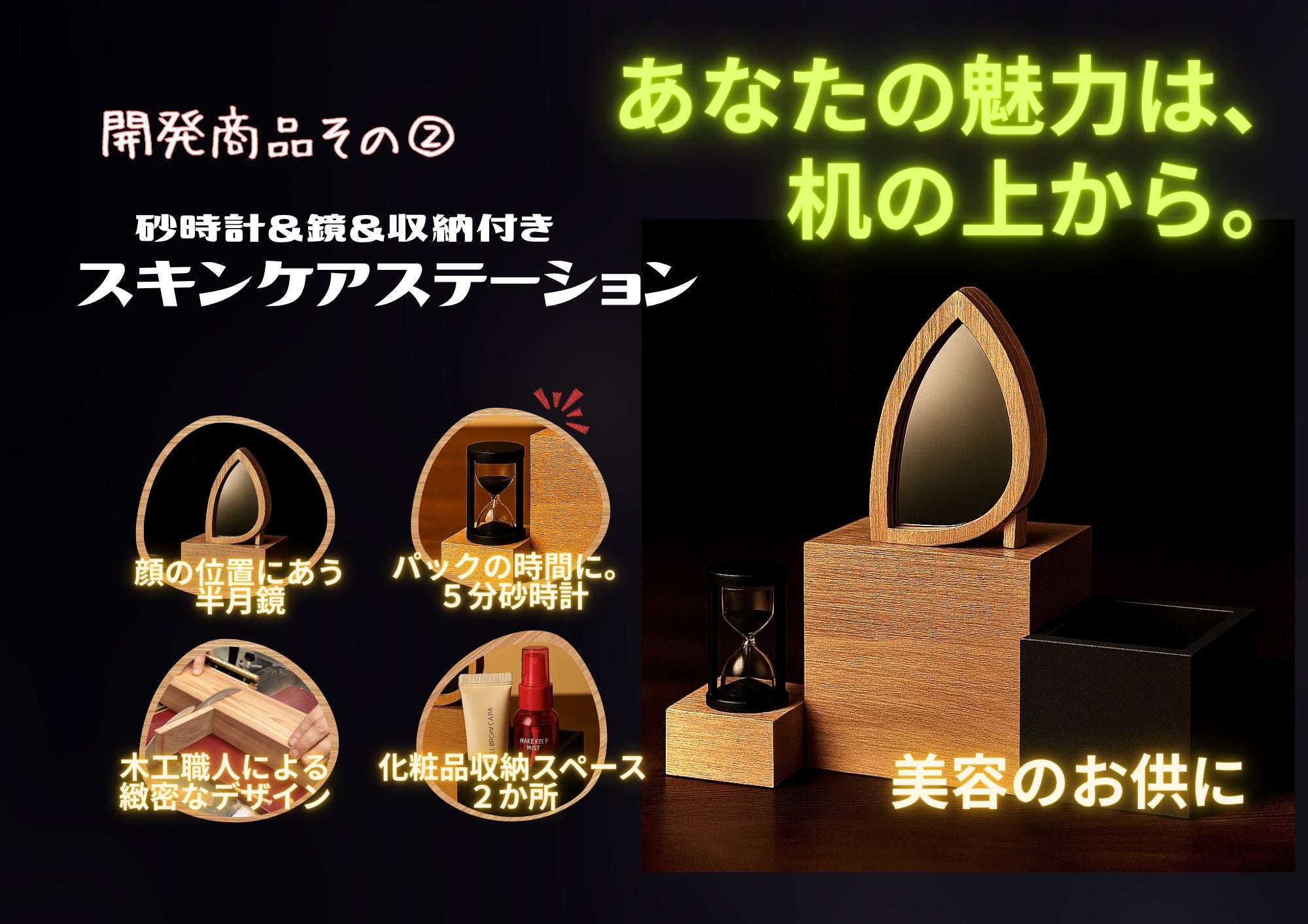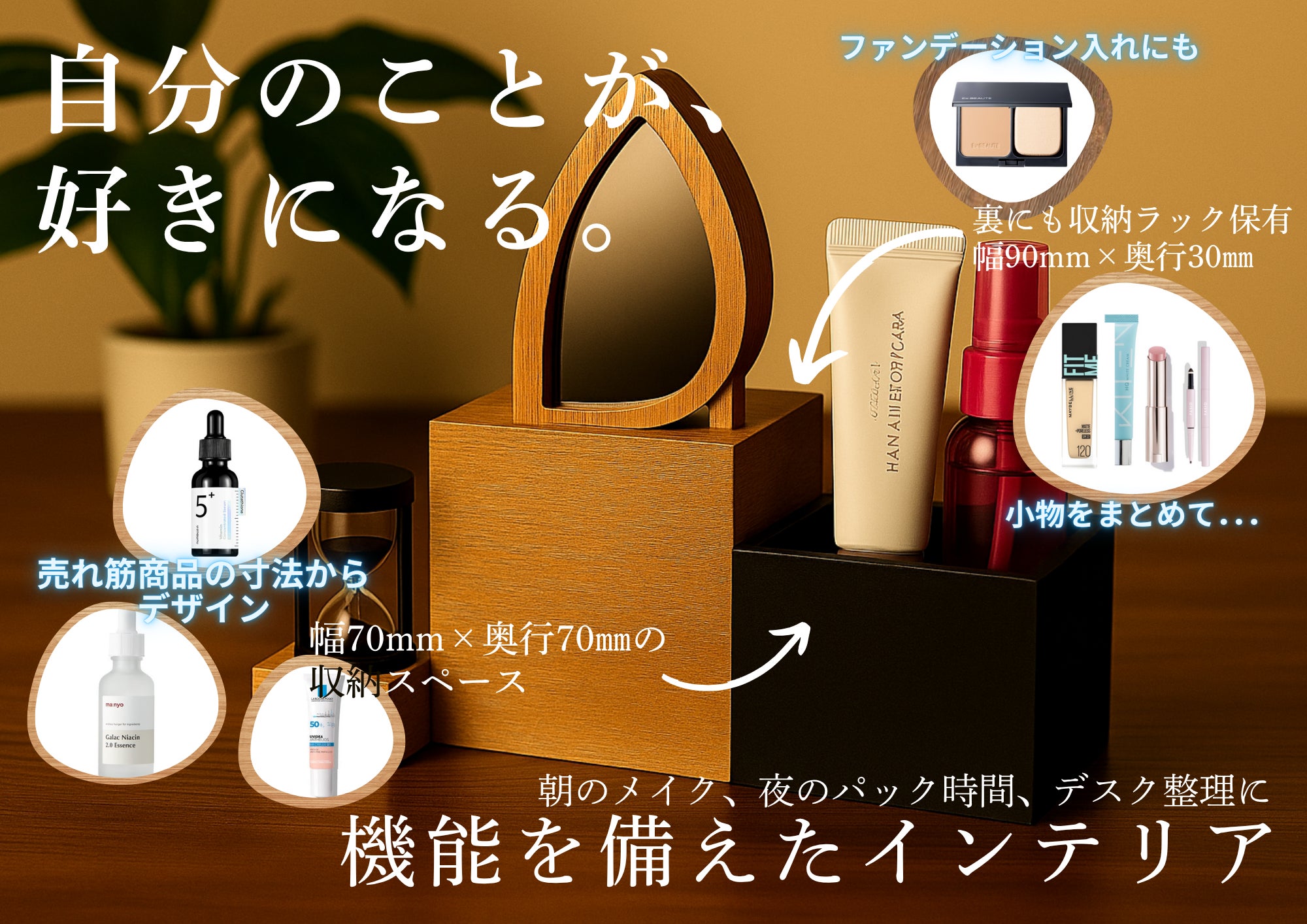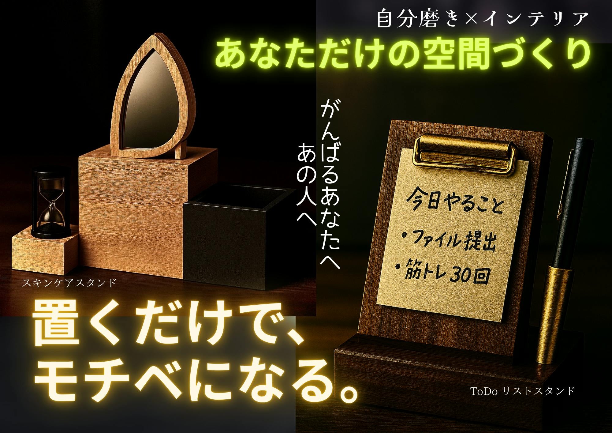 【自分の部屋が、自分のことが好きになる。】美容、勉強、お仕事、筋トレ、ダイエット…見えないところで頑張るあなたを、机の上から応援するデスクアイテムを届ける…そんなブランドを立ち上げます。本プロジェクトでは、最初の商品として、木製ToDoリストスタンドと砂時計つき化粧品収納をお届けします。