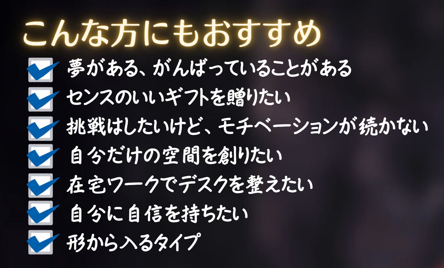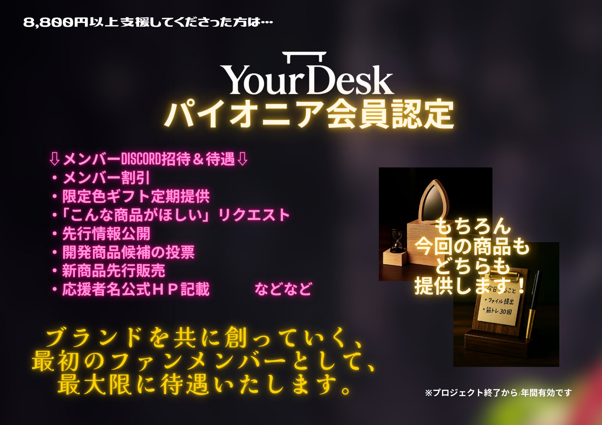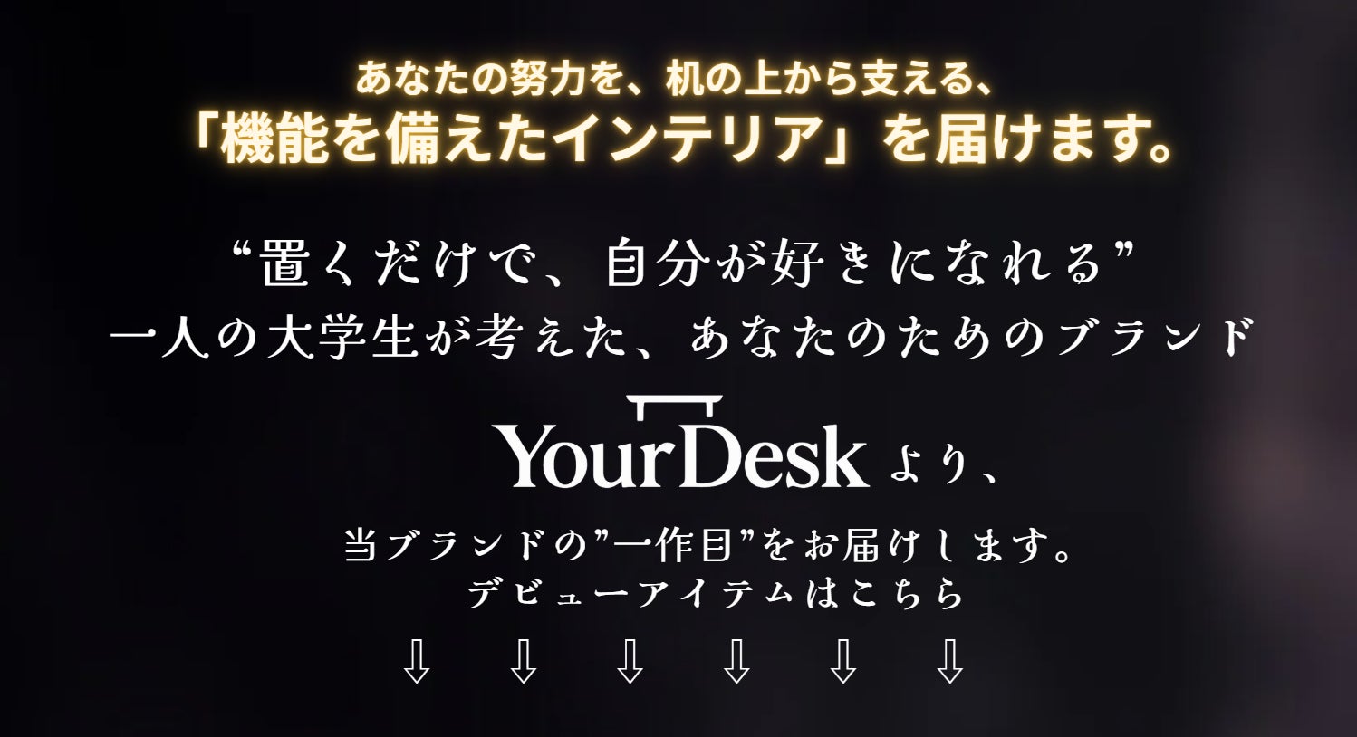 YourDesk(ユアデスク)は、がんばるあなたのためのブランドです。今回のプロジェクトでは、ただ商品を届けるだけでなく、皆さんに「がんばっている自分のことが好きになる」空間をお届けたいと考えています。企画者である私自身、このブランドを、あなたと共に成長してゆくものにしたいという想いがあり、プロジェクトを通して、互いに成長、挑戦し続けるコミュニティを形成したいと考えています。