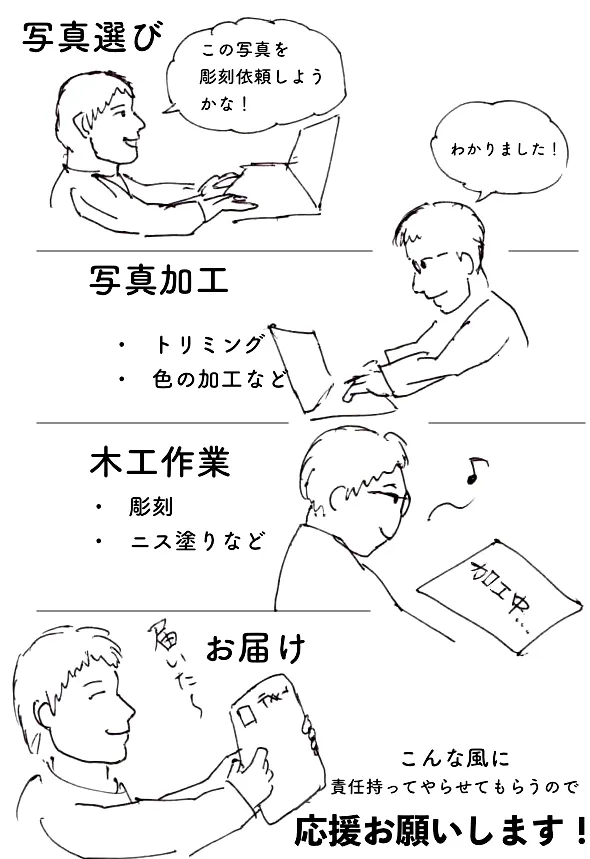・渡された写真は私の方で再度、サンプルのような木工用に写真加工させてもらいます。