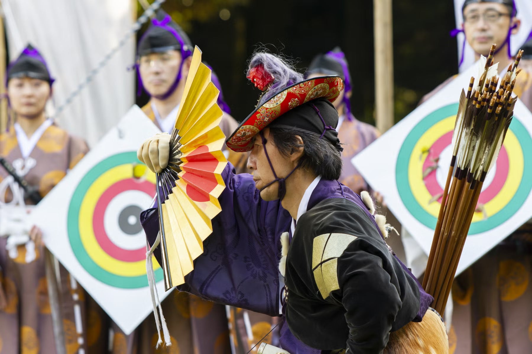 流鏑馬の射手は古式の技を身につけた特殊な技術者です。かつては上級武士のみで構成されていましたが、現代においては、普段は一般のサラリーマンや学生として生活しています。