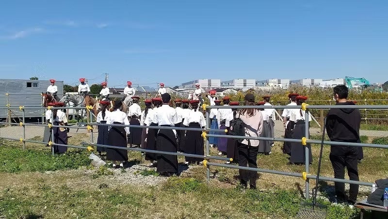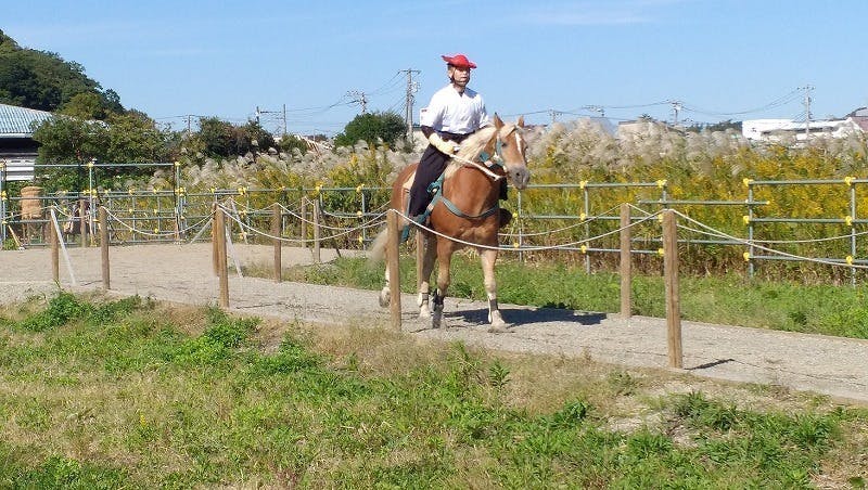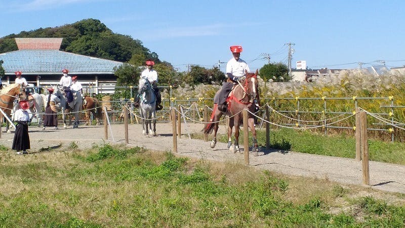 鉄砲馬場の稽古準備完了の合図があると、射手が馬を鉄砲馬場にならすため馬場本から馬場末へと移動させます。