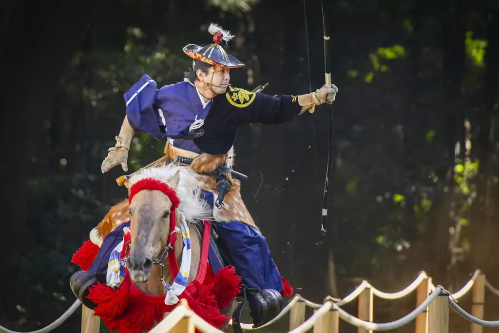 騎射は、全速力で走る馬上から的に向かって矢を放ちます。